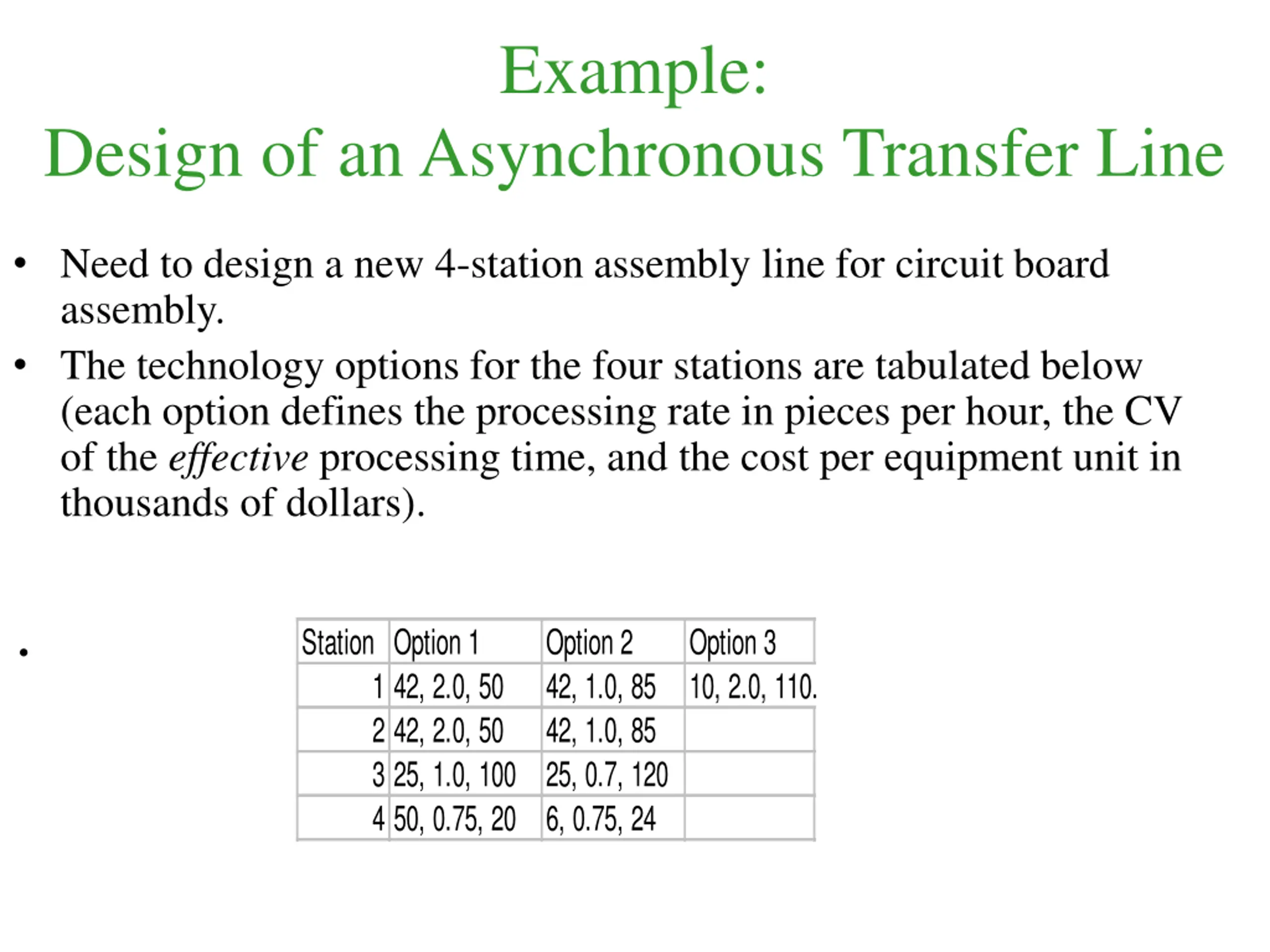 Example: Design of an Asynchronous Transfer Line Need to design a new 4-station assembly line for circuit board assembly. The technology options for the four stations are tabulated below (each option defines the processing rate in pieces per hour, the CV of the effective processing time, and the cost per equipment unit in thousands of dollars). Station Option 1 1 42, 2.0, 50 2 42, 2.0, 50 3 25, 1.0, 100 4 50, 0.75, 20 Option 2 42, 1.0, 85 42, 1.0, 85 25, 0.7, 120 6, 0.75, 24 Option 3 10, 2.0, 110.5