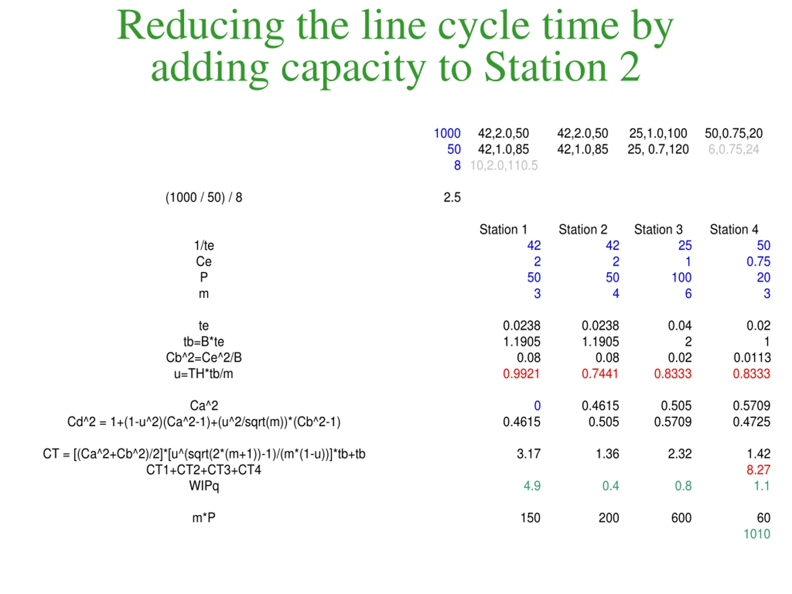 Reducing the line cycle time by adding capacity to Station 2 1000 42,2.0,50 42,1.0,85 8 10,2.0,110.5 42,2.0,50 42,1.0,85 25,1.0,100 25, 0.7,120 50,0.75,20 6,0.75,24 50 (1000 / 50) / 8 2.5 Station 1 Station 2 Station 3 Station 4 1/te Ce P m 42 2 50 3 42 2 50 4 25 1 50 0.75 20 100 6 3 te 0.0238 1.1905 0.08 0.9921 0.0238 1.1905 0.08 0.7441 0.04 0.02 tb=B*te Cb^2=Ce^2/B u=TH*tb/m 2 1 0.02 0.0113 0.8333 0.8333 Ca^2 0 0.4615 0.505 0.505 0.5709 0.5709 0.4725 Cd^2 = 1+(1-u^2)(Ca^2-1)+(u^2/sqrt(m))*(Cb^2-1) 0.4615 CT = [(Ca^2+Cb^2)/2]*[u^(sqrt(2*(m+1))-1)/(m*(1-u))]*tb+tb CT1+CT2+CT3+CT4 WIPq 3.17 1.36 2.32 1.42 8.27 1.1 4.9 0.4 0.8 m*P 150 200 600 60 1010