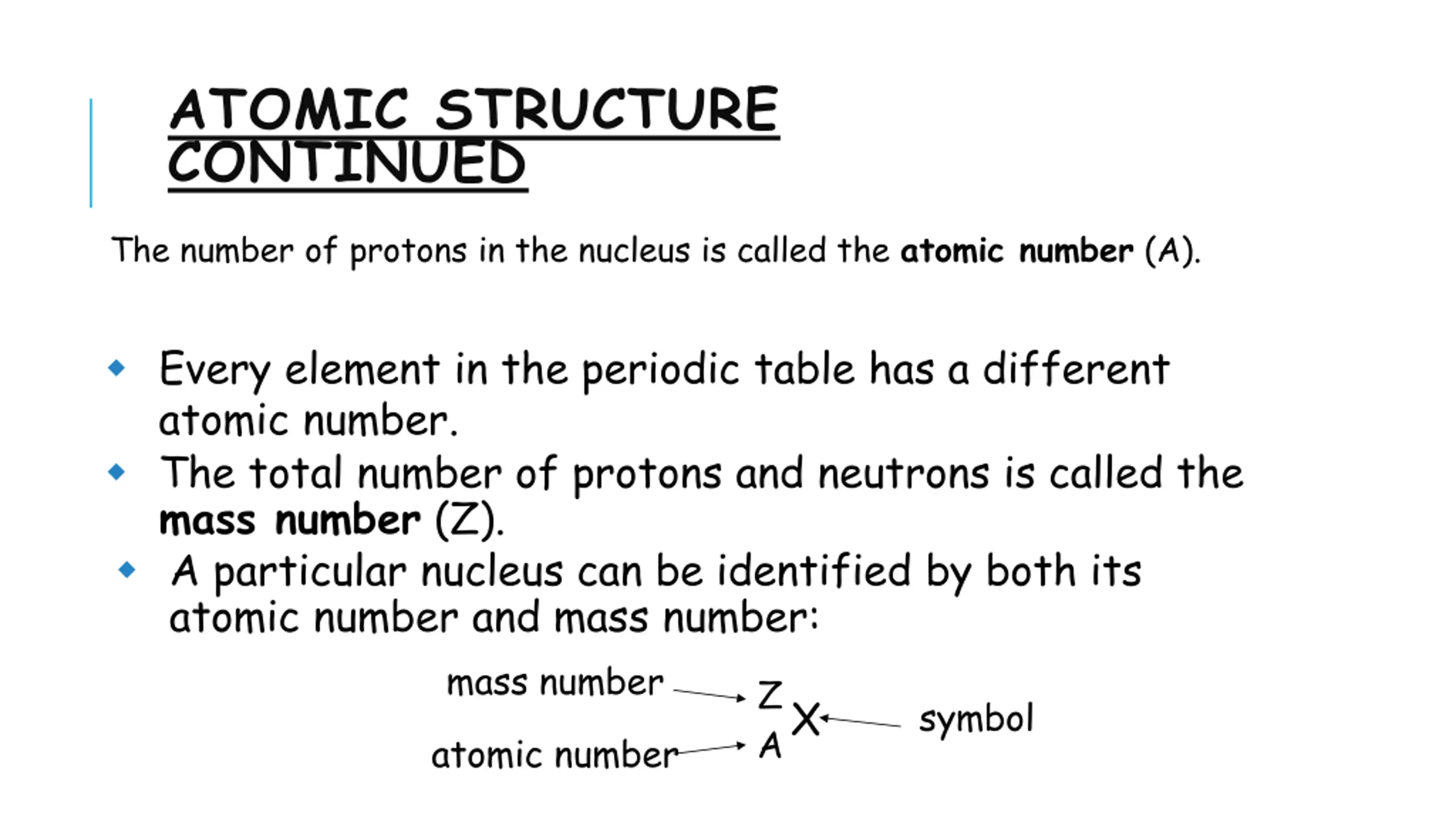 ATOMIC STRUCTURE CONTINUED The number of protons in the nucleus is called the atomic number (A). Every element in the periodic table has a different atomic number. The total number of protons and neutrons is called the mass number (Z). A particular nucleus can be identified by both its atomic number and mass number: mass number Z AX symbol atomic number