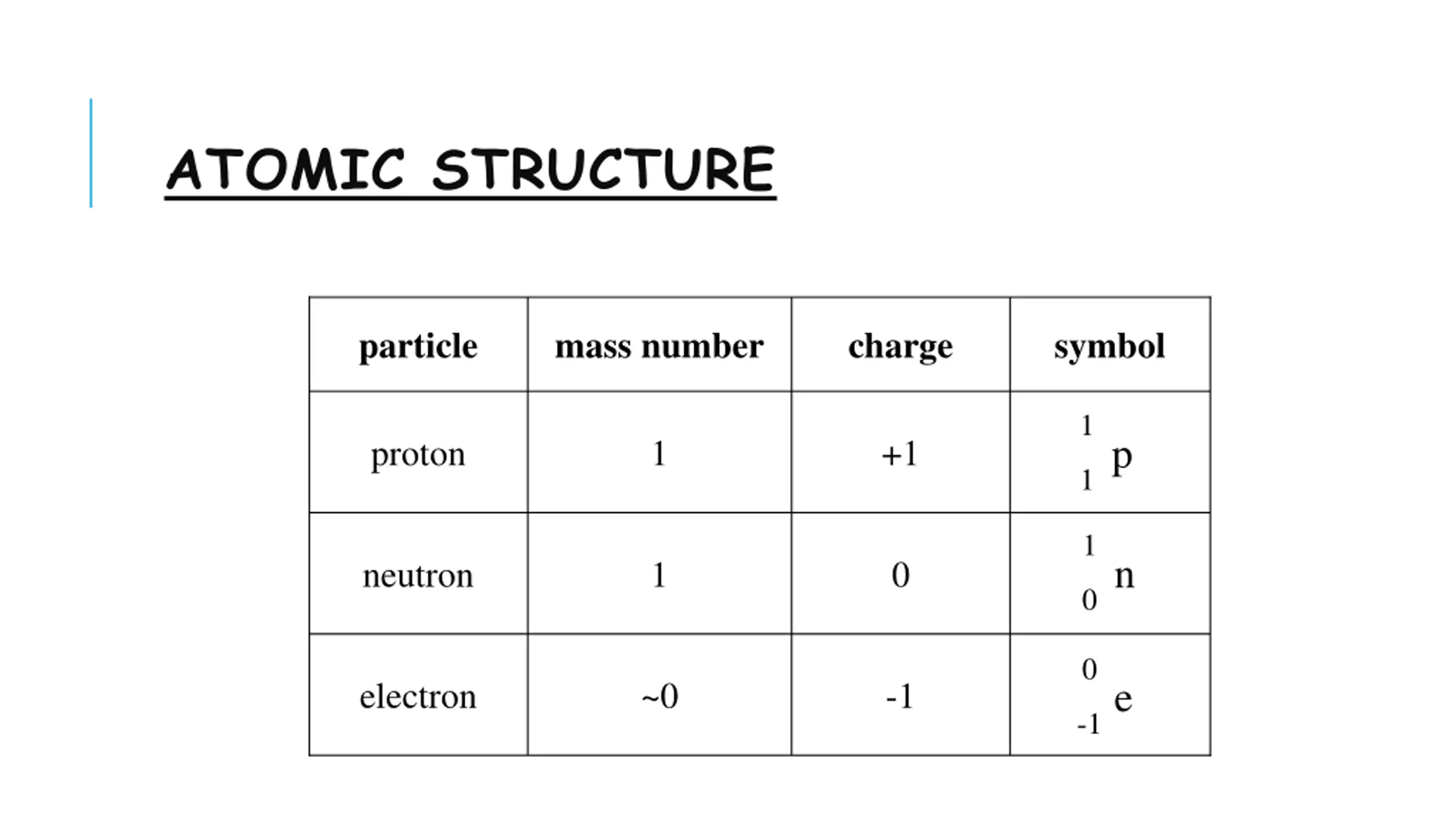 ATOMIC STRUCTURE particle mass number charge symbol 1 1p proton 1 +1 1 0n neutron 1 0 0 -1e electron ~0 -1