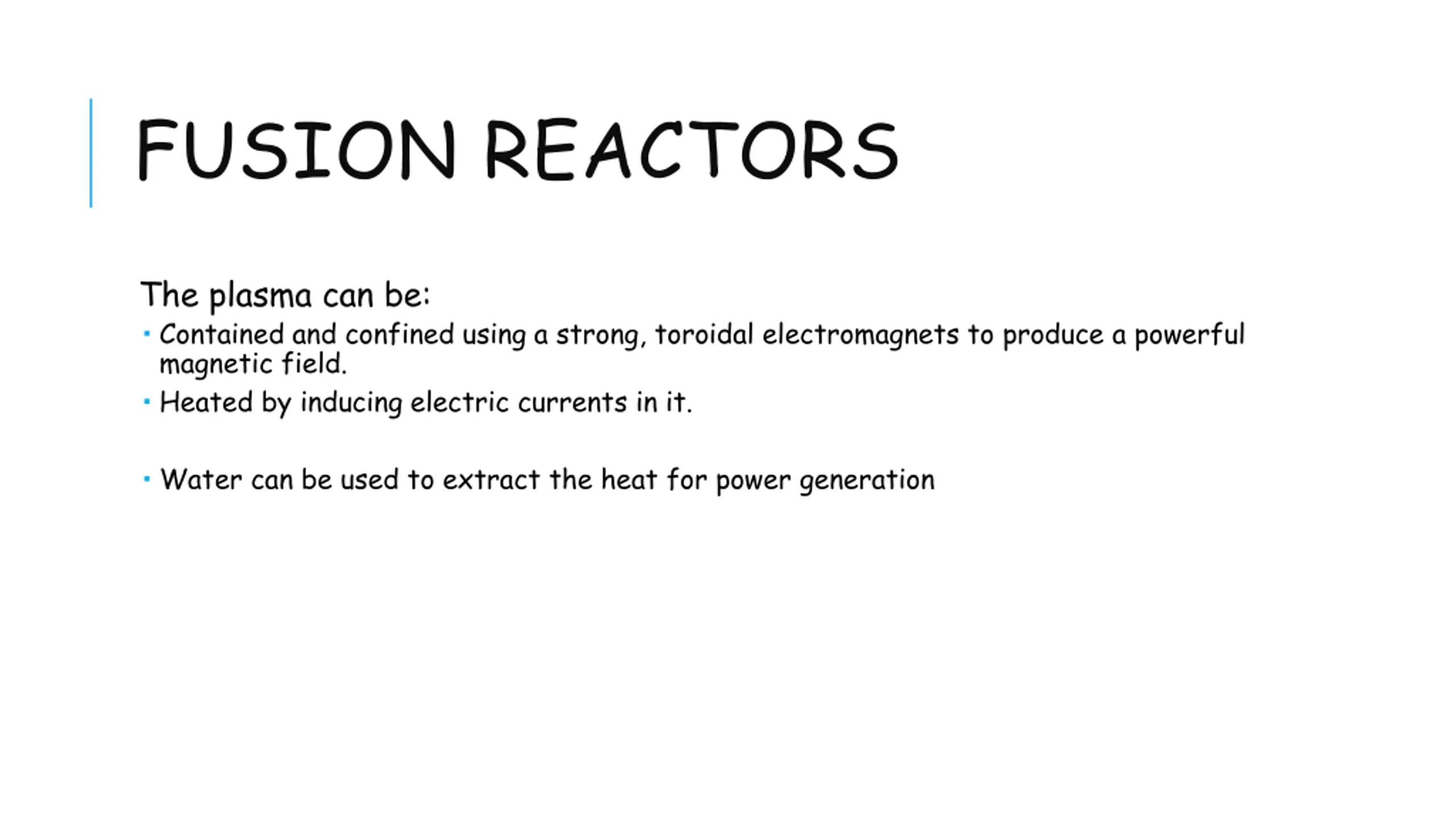 FUSION REACTORS The plasma can be: Contained and confined using a strong, toroidal electromagnets to produce a powerful magnetic field. Heated by inducing electric currents in it. Water can be used to extract the heat for power generation