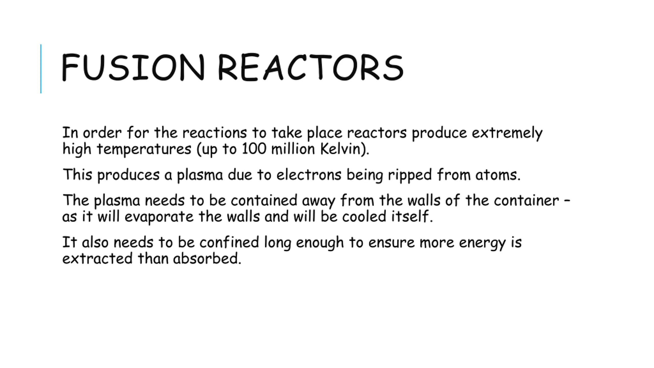 FUSION REACTORS In order for the reactions to take place reactors produce extremely high temperatures (up to 100 million Kelvin). This produces a plasma due to electrons being ripped from atoms. The plasma needs to be contained away from the walls of the container as it will evaporate the walls and will be cooled itself. It also needs to be confined long enough to ensure more energy is extracted than absorbed.