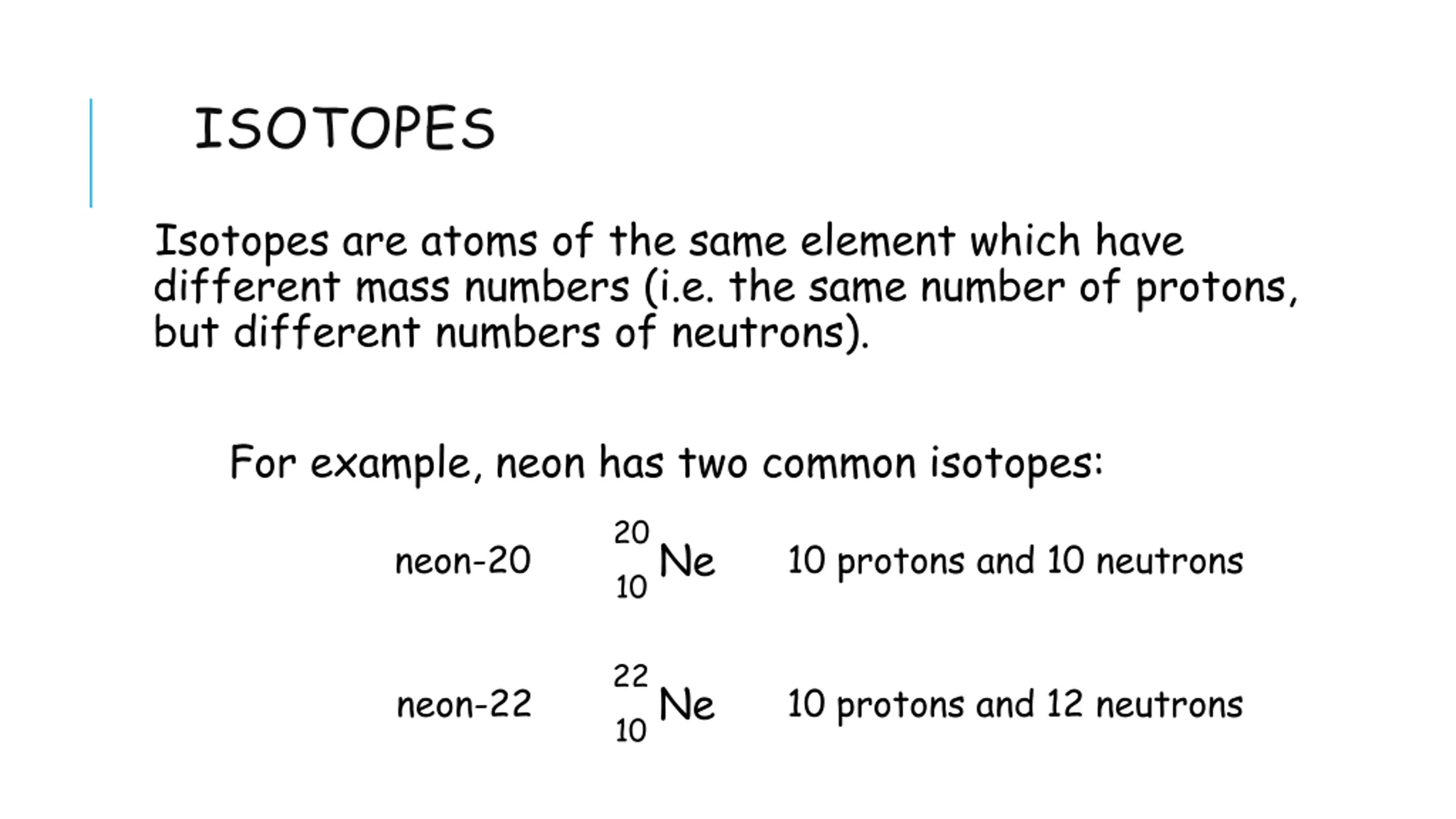 ISOTOPES Isotopes are atoms of the same element which have different mass numbers (i.e. the same number of protons, but different numbers of neutrons). For example, neon has two common isotopes: 20 10Ne neon-20 10 protons and 10 neutrons 22 10Ne neon-22 10 protons and 12 neutrons
