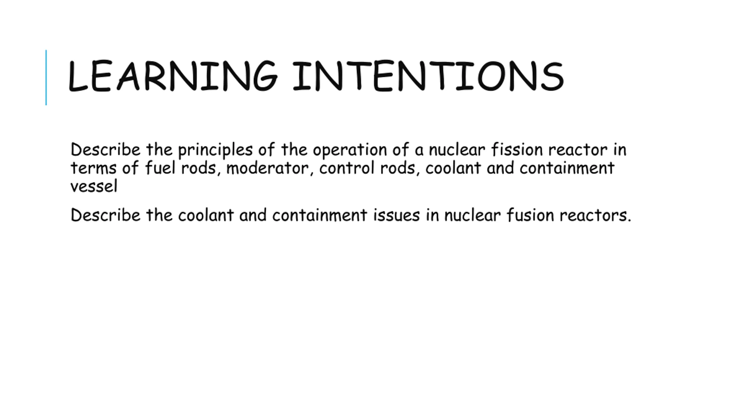 LEARNING INTENTIONS Describe the principles of the operation of a nuclear fission reactor in terms of fuel rods, moderator, control rods, coolant and containment vessel Describe the coolant and containment issues in nuclear fusion reactors.