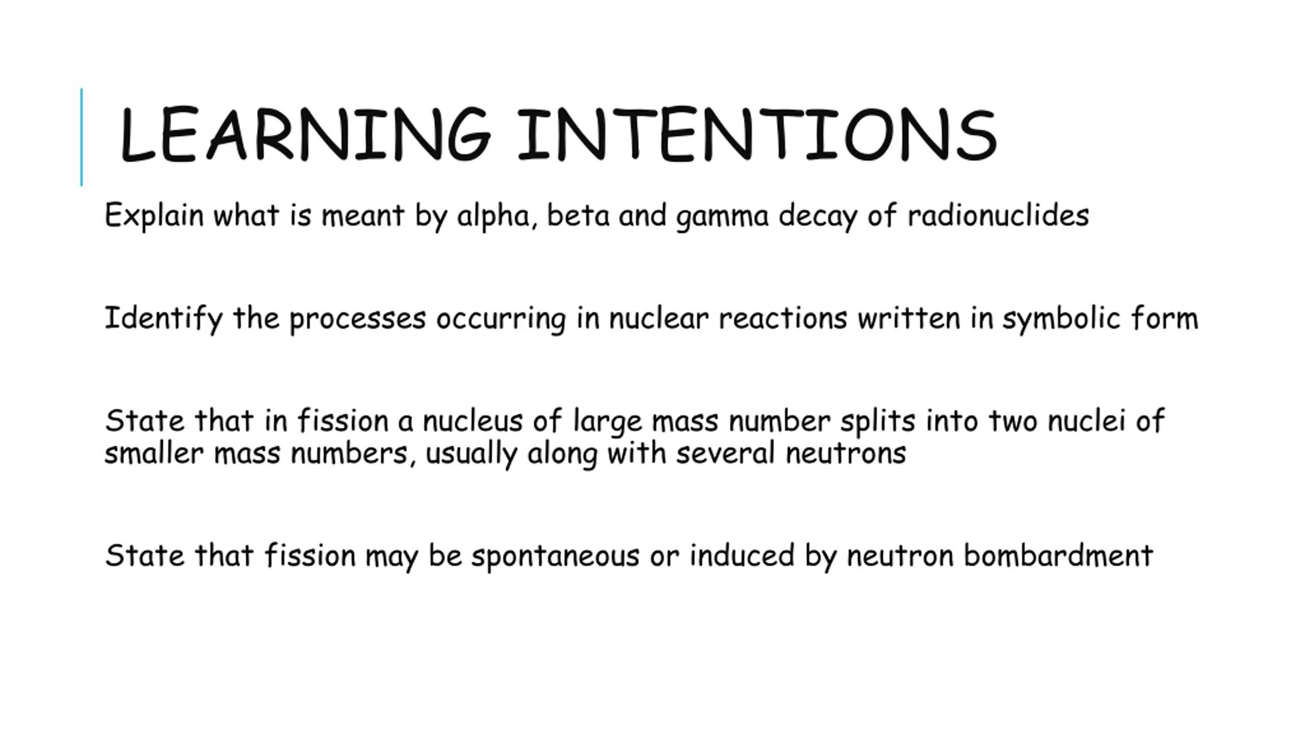LEARNING INTENTIONS Explain what is meant by alpha, beta and gamma decay of radionuclides Identify the processes occurring in nuclear reactions written in symbolic form State that in fission a nucleus of large mass number splits into two nuclei of smaller mass numbers, usually along with several neutrons State that fission may be spontaneous or induced by neutron bombardment