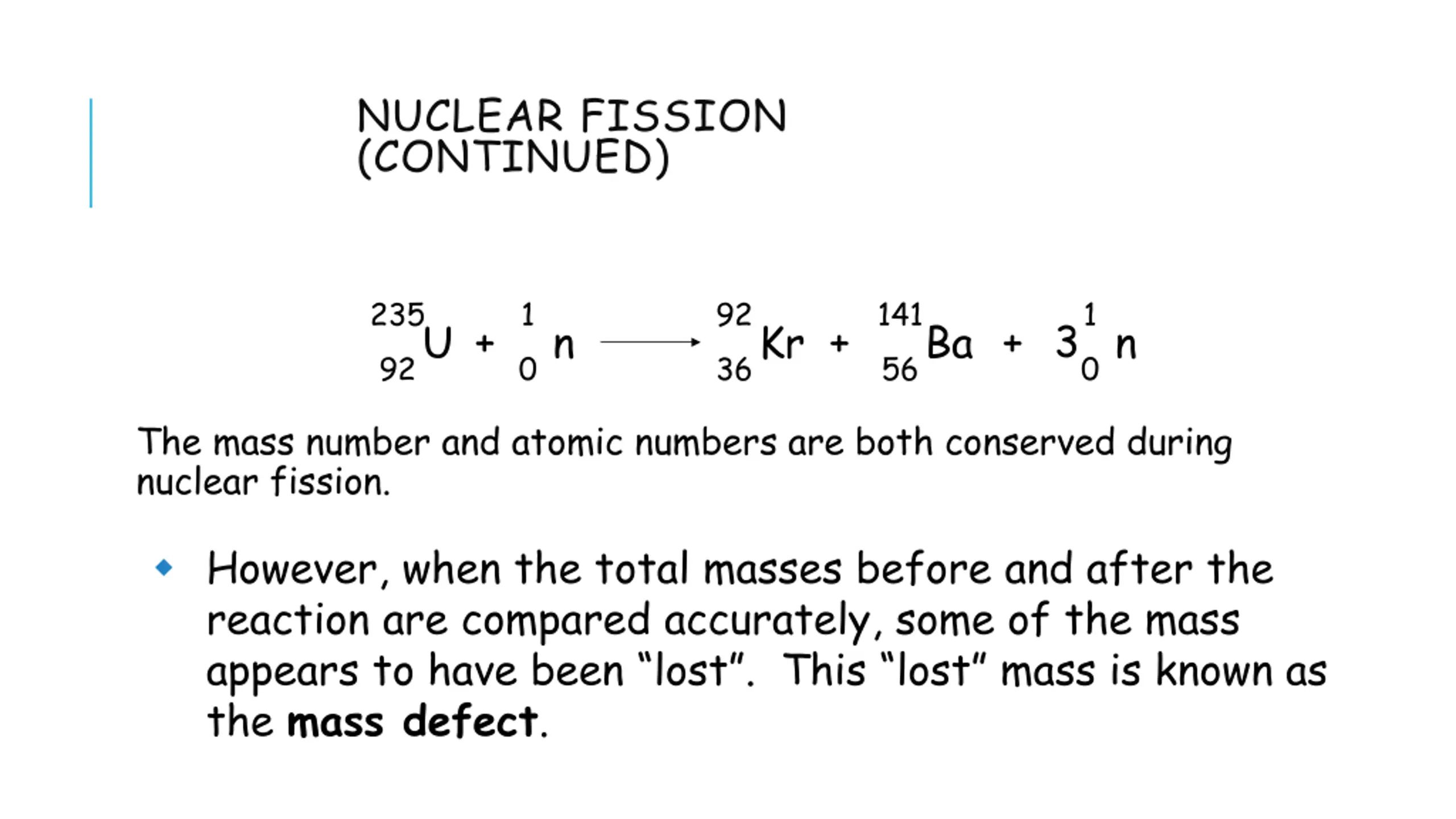 NUCLEAR FISSION (CONTINUED) 235 92U 1 0n 92 36Kr 141 56Ba 1 0n + + + 3 The mass number and atomic numbers are both conserved during nuclear fission. However, when the total masses before and after the reaction are compared accurately, some of the mass appears to have been lost . This lost mass is known as the mass defect.