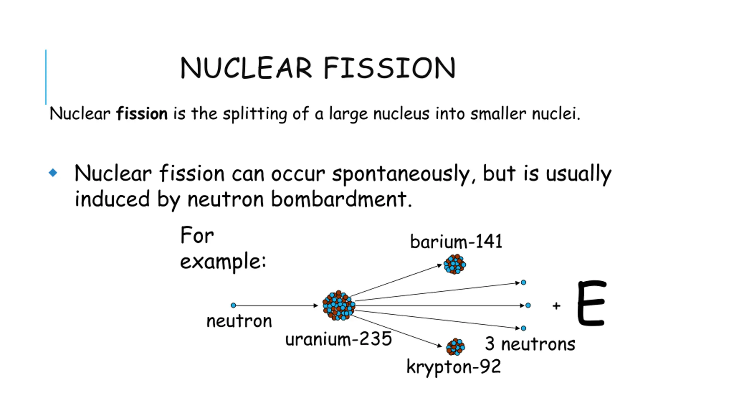 NUCLEAR FISSION Nuclear fission is the splitting of a large nucleus into smaller nuclei. Nuclear fission can occur spontaneously, but is usually induced by neutron bombardment. For example: barium-141 +E neutron uranium-235 3 neutrons krypton-92