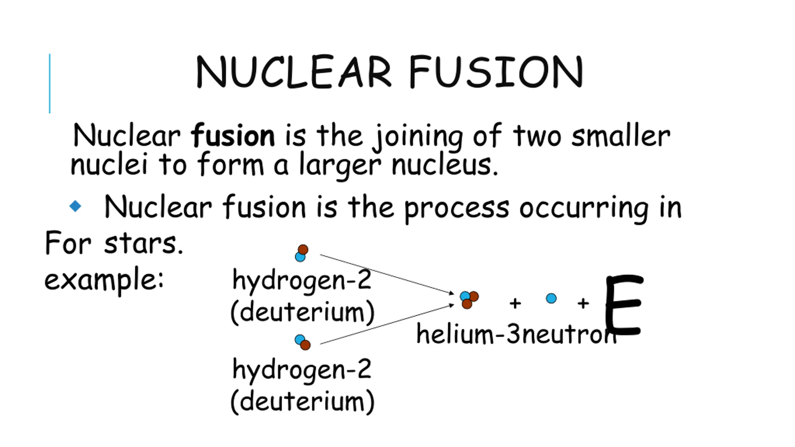 NUCLEAR FUSION Nuclear fusion is the joining of two smaller nuclei to form a larger nucleus. Nuclear fusion is the process occurring in stars. For example: hydrogen-2 (deuterium) +E + neutron helium-3 hydrogen-2 (deuterium)