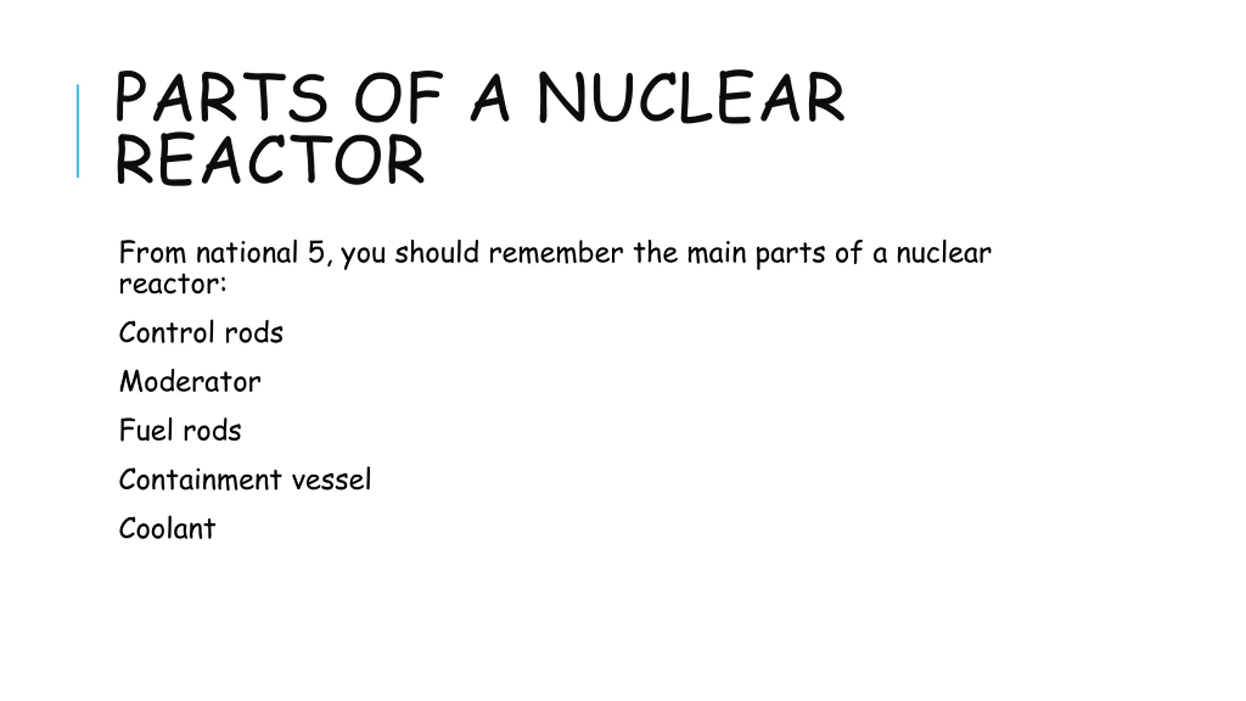 PARTS OF A NUCLEAR REACTOR From national 5, you should remember the main parts of a nuclear reactor: Control rods Moderator Fuel rods Containment vessel Coolant