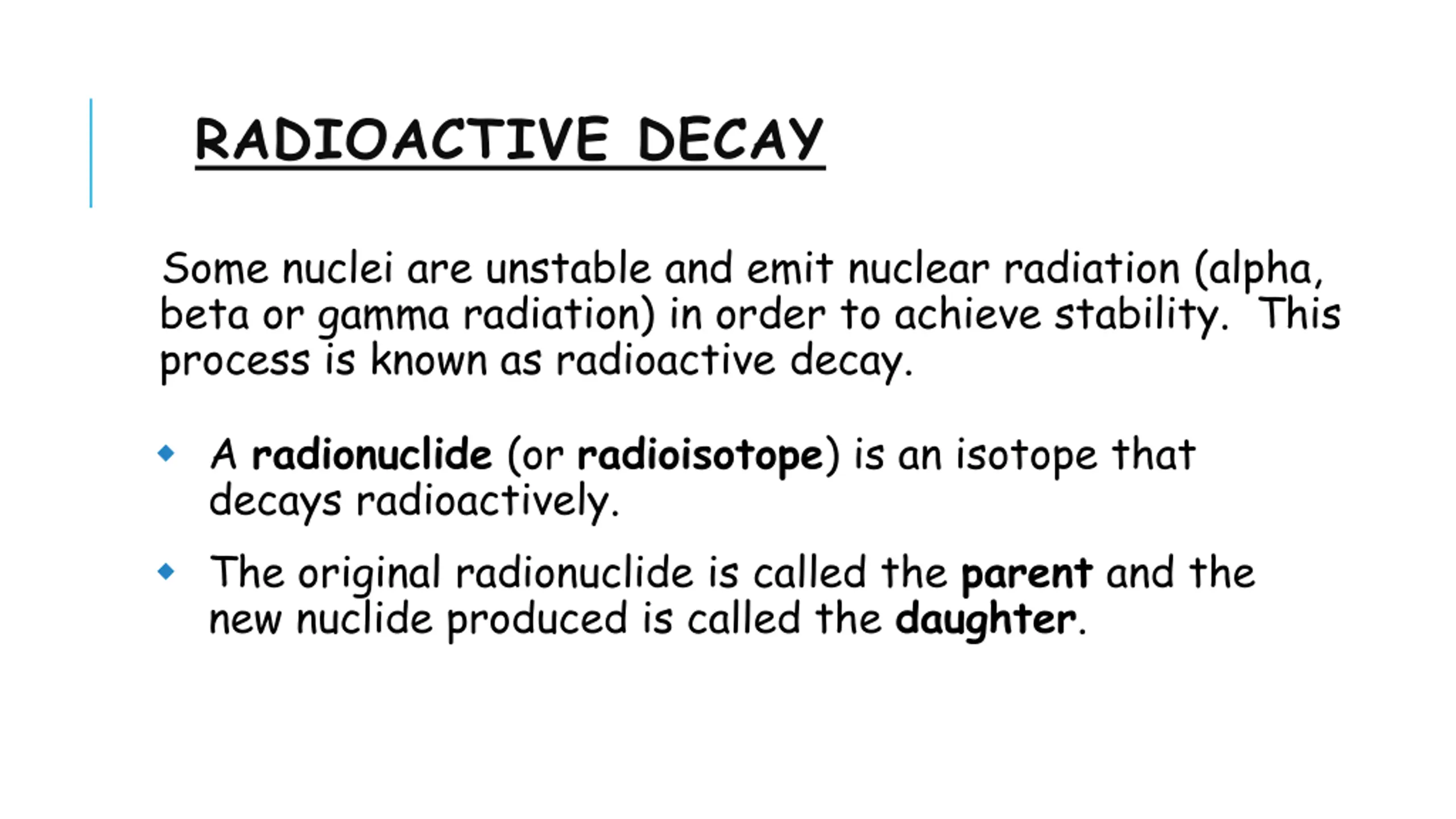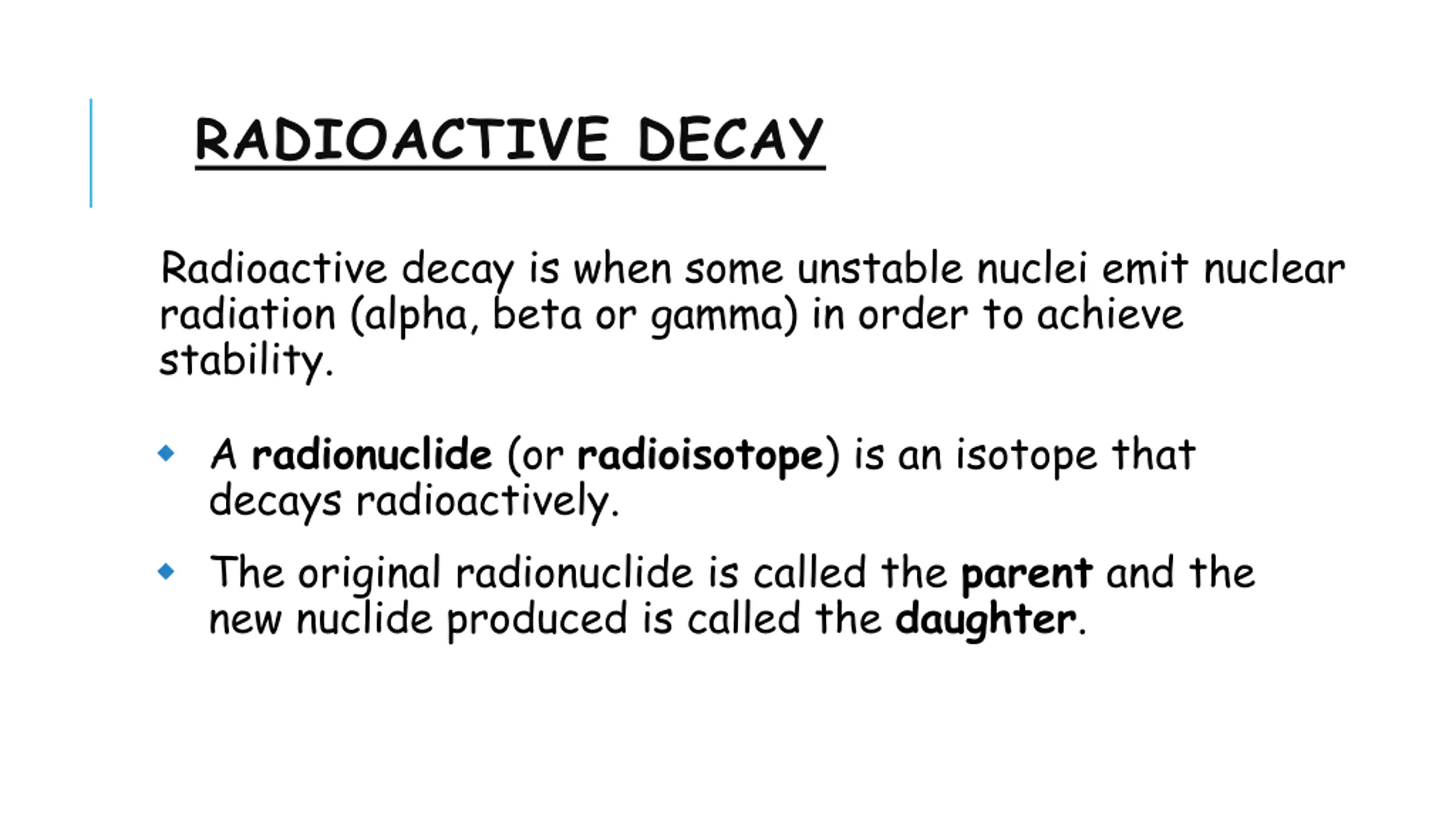 RADIOACTIVE DECAY Some nuclei are unstable and emit nuclear radiation (alpha, beta or gamma radiation) in order to achieve stability. This process is known as radioactive decay. A radionuclide (or radioisotope) is an isotope that decays radioactively. The original radionuclide is called the parent and the new nuclide produced is called the daughter.