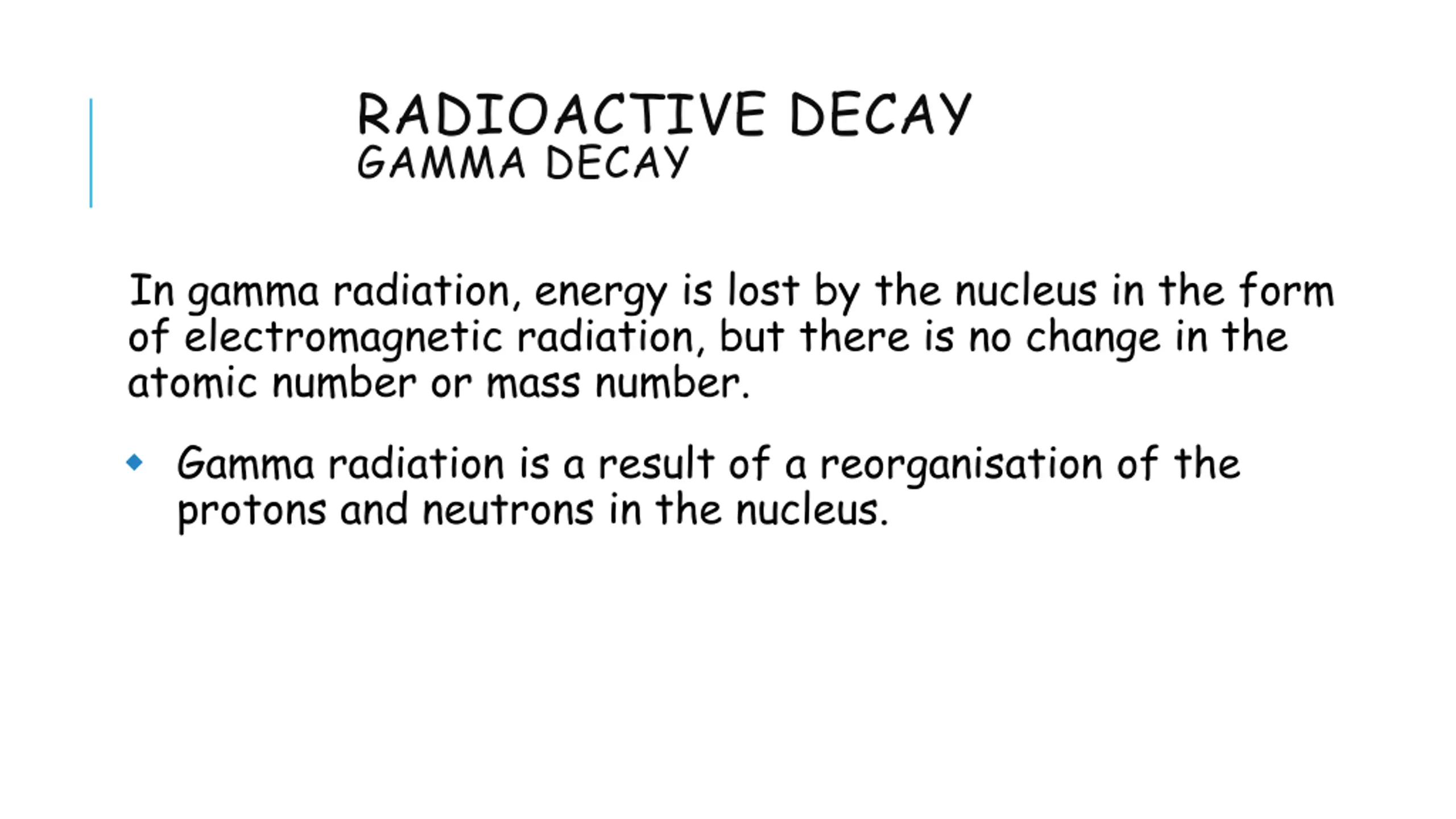 RADIOACTIVE DECAY GAMMA DECAY In gamma radiation, energy is lost by the nucleus in the form of electromagnetic radiation, but there is no change in the atomic number or mass number. Gamma radiation is a result of a reorganisation of the protons and neutrons in the nucleus.