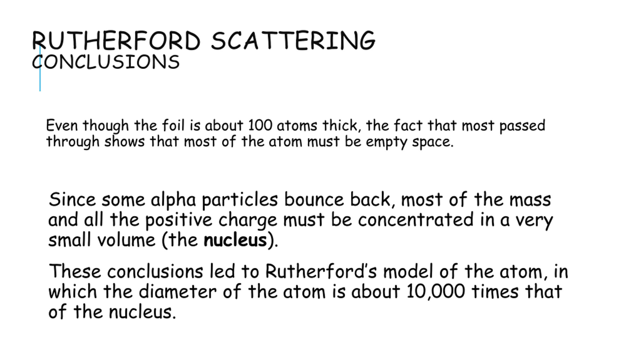RUTHERFORD SCATTERING CONCLUSIONS Even though the foil is about 100 atoms thick, the fact that most passed through shows that most of the atom must be empty space. Since some alpha particles bounce back, most of the mass and all the positive charge must be concentrated in a very small volume (the nucleus). These conclusions led to Rutherford s model of the atom, in which the diameter of the atom is about 10,000 times that of the nucleus.