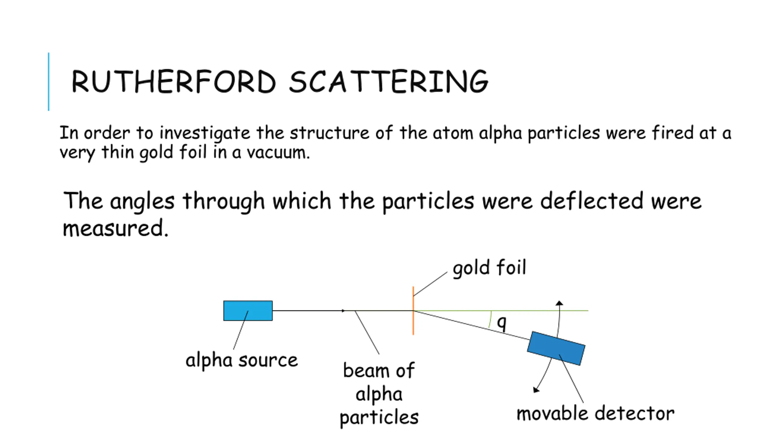RUTHERFORD SCATTERING In order to investigate the structure of the atom alpha particles were fired at a very thin gold foil in a vacuum. The angles through which the particles were deflected were measured. gold foil q alpha source beam of alpha particles movable detector