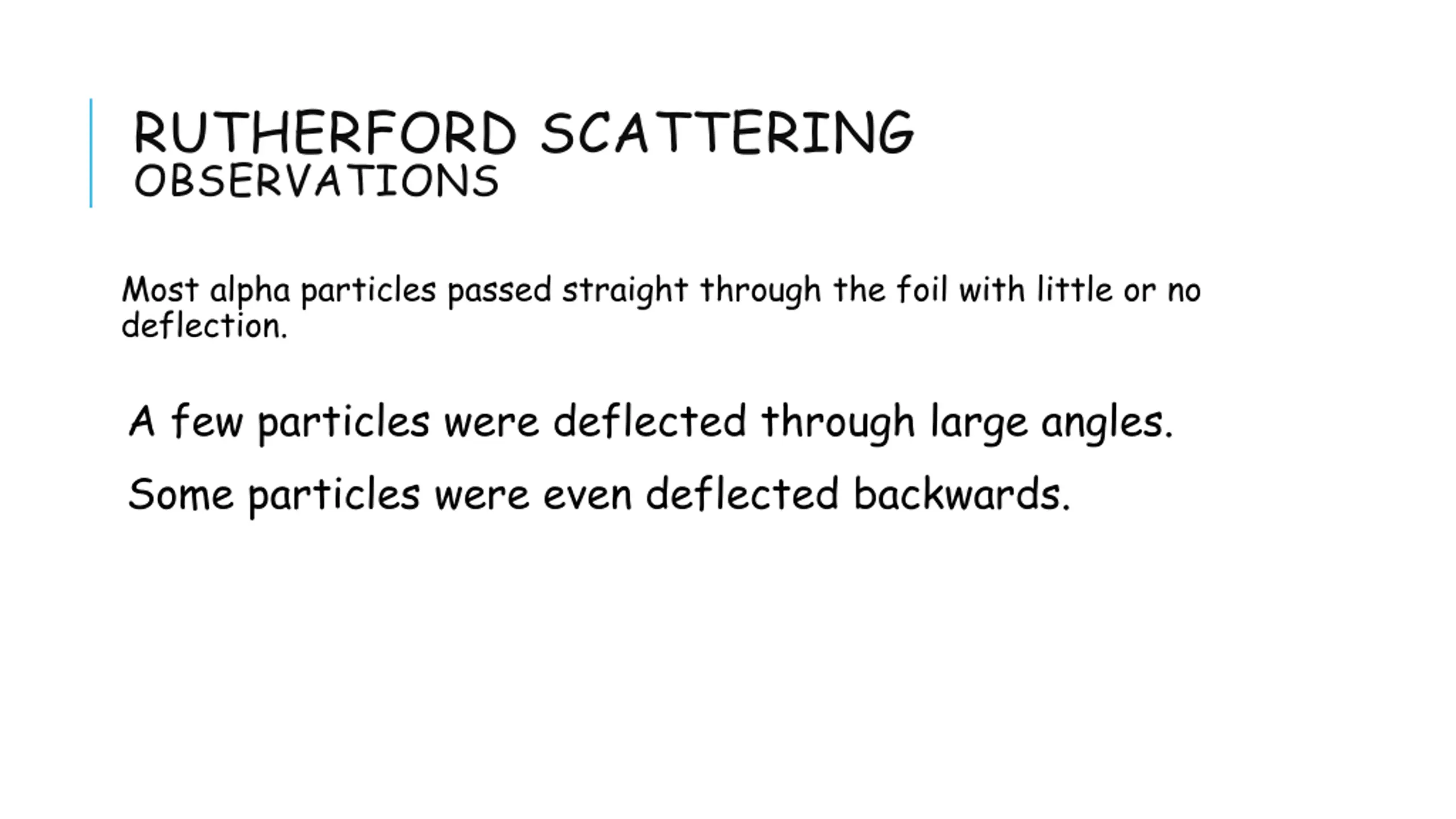 RUTHERFORD SCATTERING OBSERVATIONS Most alpha particles passed straight through the foil with little or no deflection. A few particles were deflected through large angles. Some particles were even deflected backwards.
