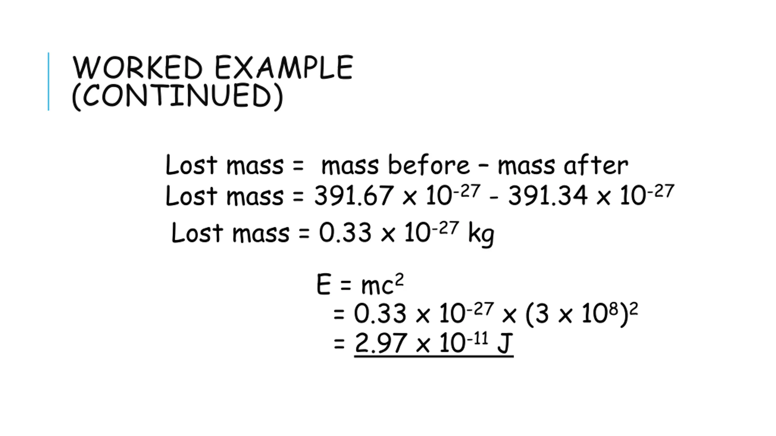 WORKED EXAMPLE (CONTINUED) Lost mass = mass before mass after Lost mass = 391.67 x 10-27 - 391.34 x 10-27 Lost mass = 0.33 x 10-27 kg E = mc2 = 0.33 x 10-27 x (3 x 108)2 = 2.97 x 10-11 J