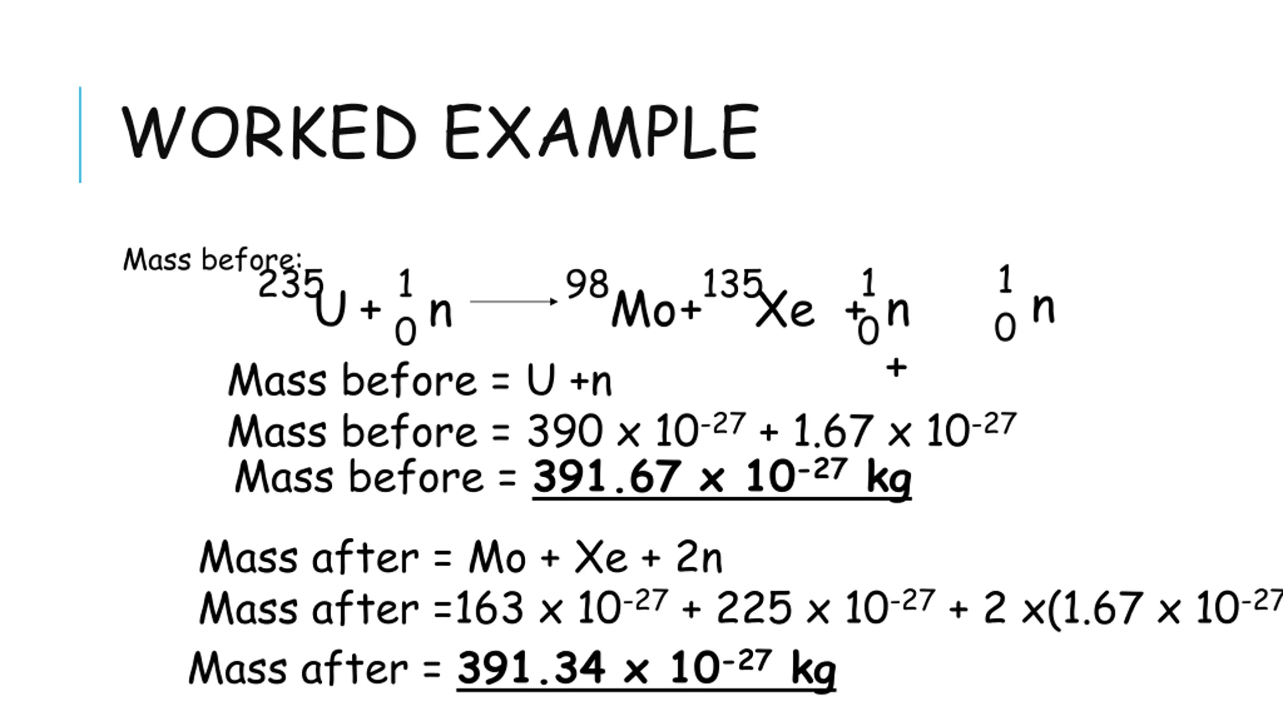 WORKED EXAMPLE Mass before: 1 0n 1 0n + 235U 1 0n 98Mo 135Xe + + + Mass before = U +n Mass before = 390 x 10-27 + 1.67 x 10-27 Mass before = 391.67 x 10-27 kg Mass after = Mo + Xe + 2n Mass after =163 x 10-27 + 225 x 10-27 + 2 x(1.67 x 10-27 Mass after = 391.34 x 10-27 kg
