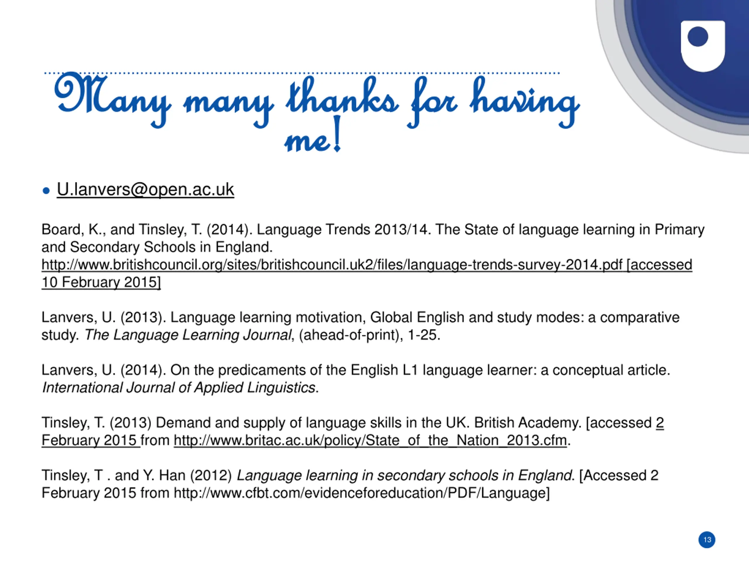 Many Many many many thanks for having thanks for having me! me! U.lanvers@open.ac.uk Board, K., and Tinsley, T. (2014). Language Trends 2013/14. The State of language learning in Primary and Secondary Schools in England. http://www.britishcouncil.org/sites/britishcouncil.uk2/files/language-trends-survey-2014.pdf [accessed 10 February 2015] Lanvers, U. (2013). Language learning motivation, Global English and study modes: a comparative study. The Language Learning Journal, (ahead-of-print), 1-25. Lanvers, U. (2014). On the predicaments of the English L1 language learner: a conceptual article. International Journal of Applied Linguistics. Tinsley, T. (2013) Demand and supply of language skills in the UK. British Academy. [accessed 2 February 2015 from http://www.britac.ac.uk/policy/State_of_the_Nation_2013.cfm. Tinsley, T . and Y. Han (2012) Language learning in secondary schools in England. [Accessed 2 February 2015 from http://www.cfbt.com/evidenceforeducation/PDF/Language] 13
