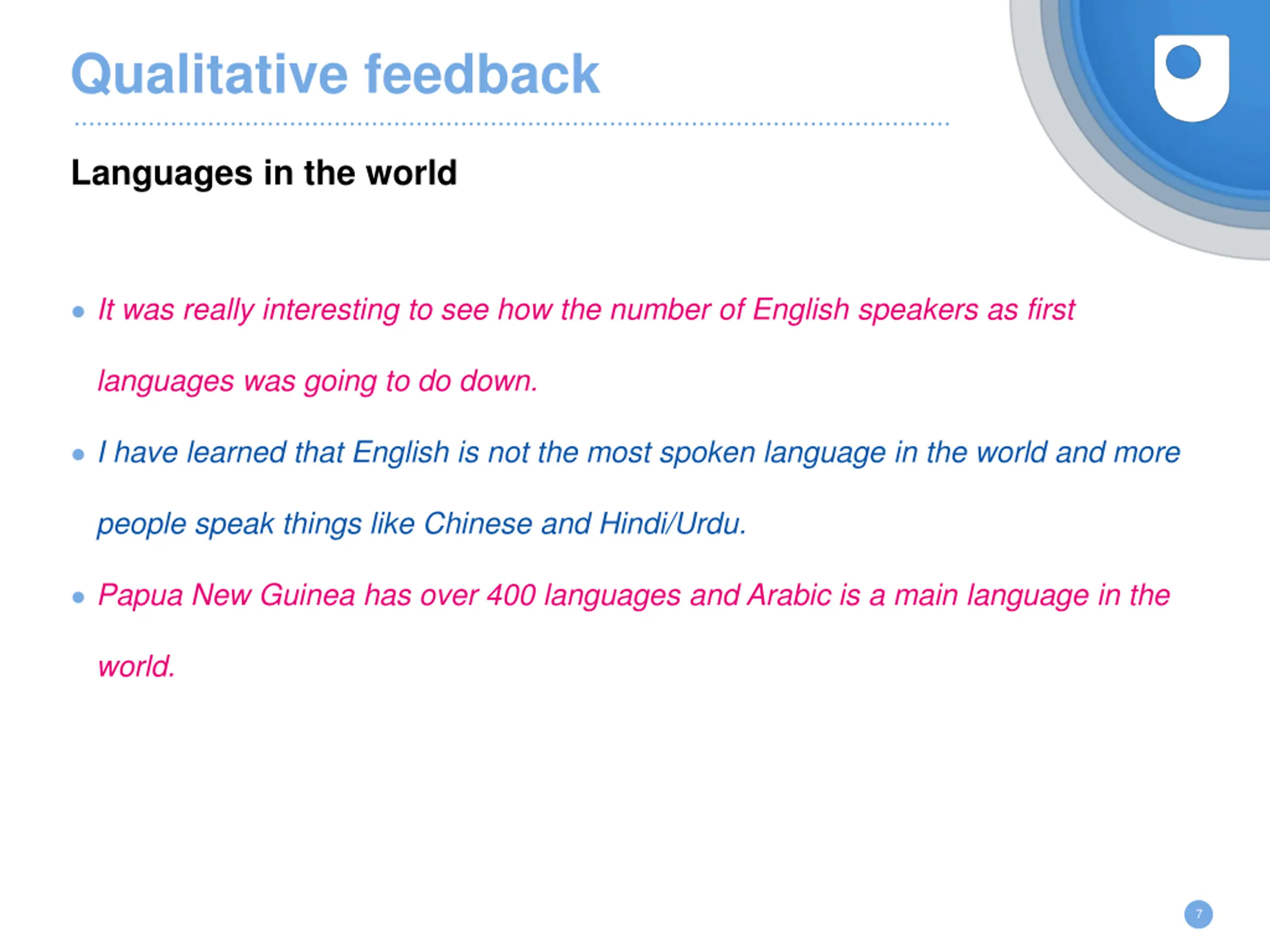 Qualitative feedback Languages in the world It was really interesting to see how the number of English speakers as first languages was going to do down. I have learned that English is not the most spoken language in the world and more people speak things like Chinese and Hindi/Urdu. Papua New Guinea has over 400 languages and Arabic is a main language in the world. 7