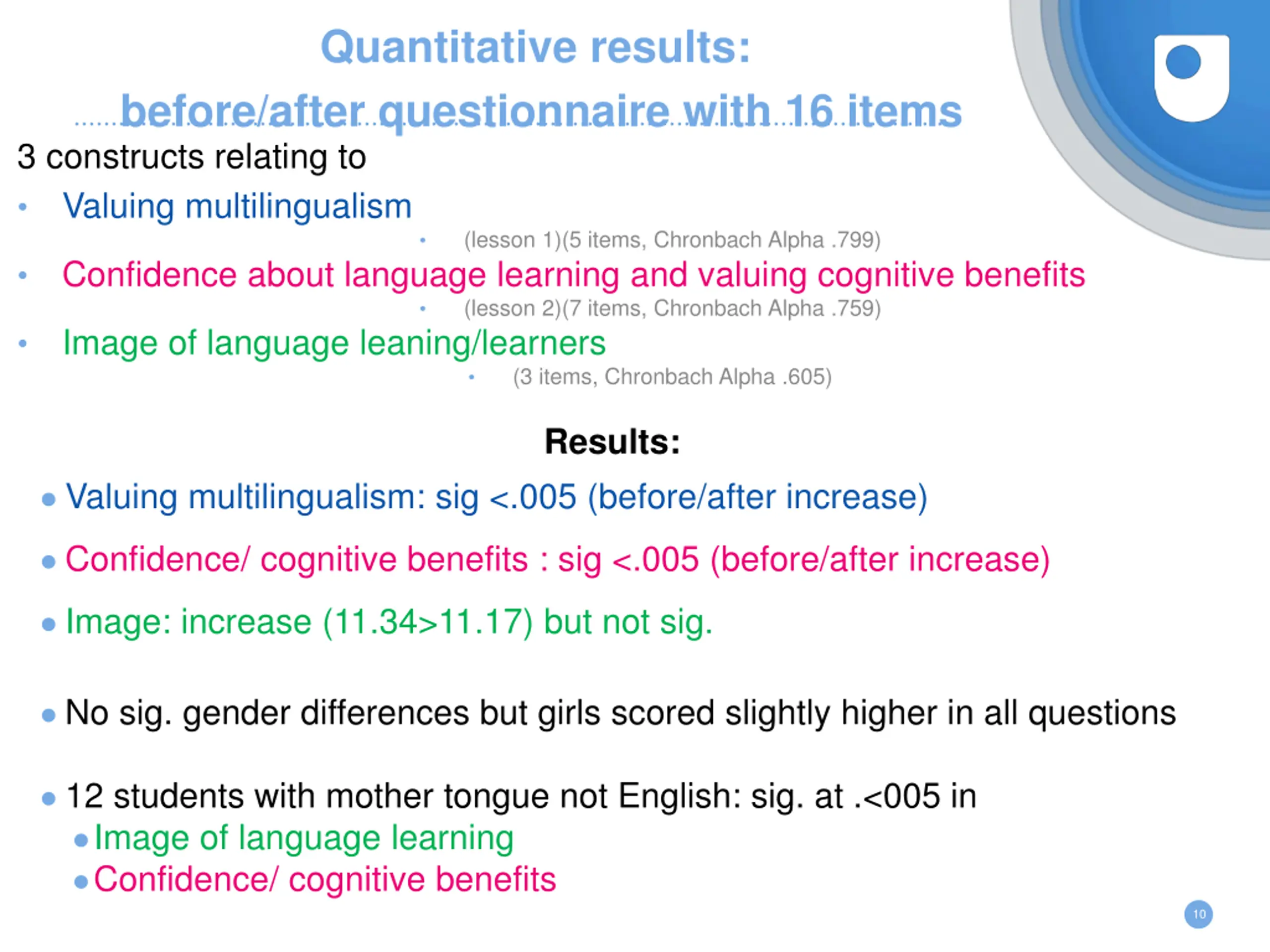 Quantitative results: before/after questionnaire with 16 items 3 constructs relating to Valuing multilingualism (lesson 1)(5 items, Chronbach Alpha .799) Confidence about language learning and valuing cognitive benefits (lesson 2)(7 items, Chronbach Alpha .759) Image of language leaning/learners (3 items, Chronbach Alpha .605) Results: Valuing multilingualism: sig <.005 (before/after increase) Confidence/ cognitive benefits : sig <.005 (before/after increase) Image: increase (11.34>11.17) but not sig. No sig. gender differences but girls scored slightly higher in all questions 12 students with mother tongue not English: sig. at .<005 in Image of language learning Confidence/ cognitive benefits 10