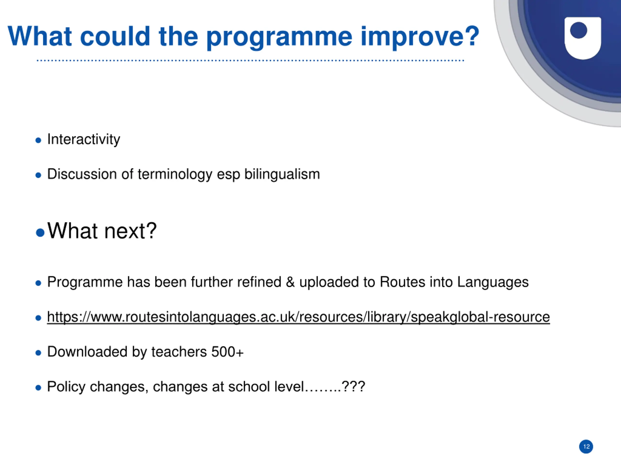 What could the programme improve? Interactivity Discussion of terminology esp bilingualism What next? Programme has been further refined & uploaded to Routes into Languages https://www.routesintolanguages.ac.uk/resources/library/speakglobal-resource Downloaded by teachers 500+ Policy changes, changes at school level ..??? 12