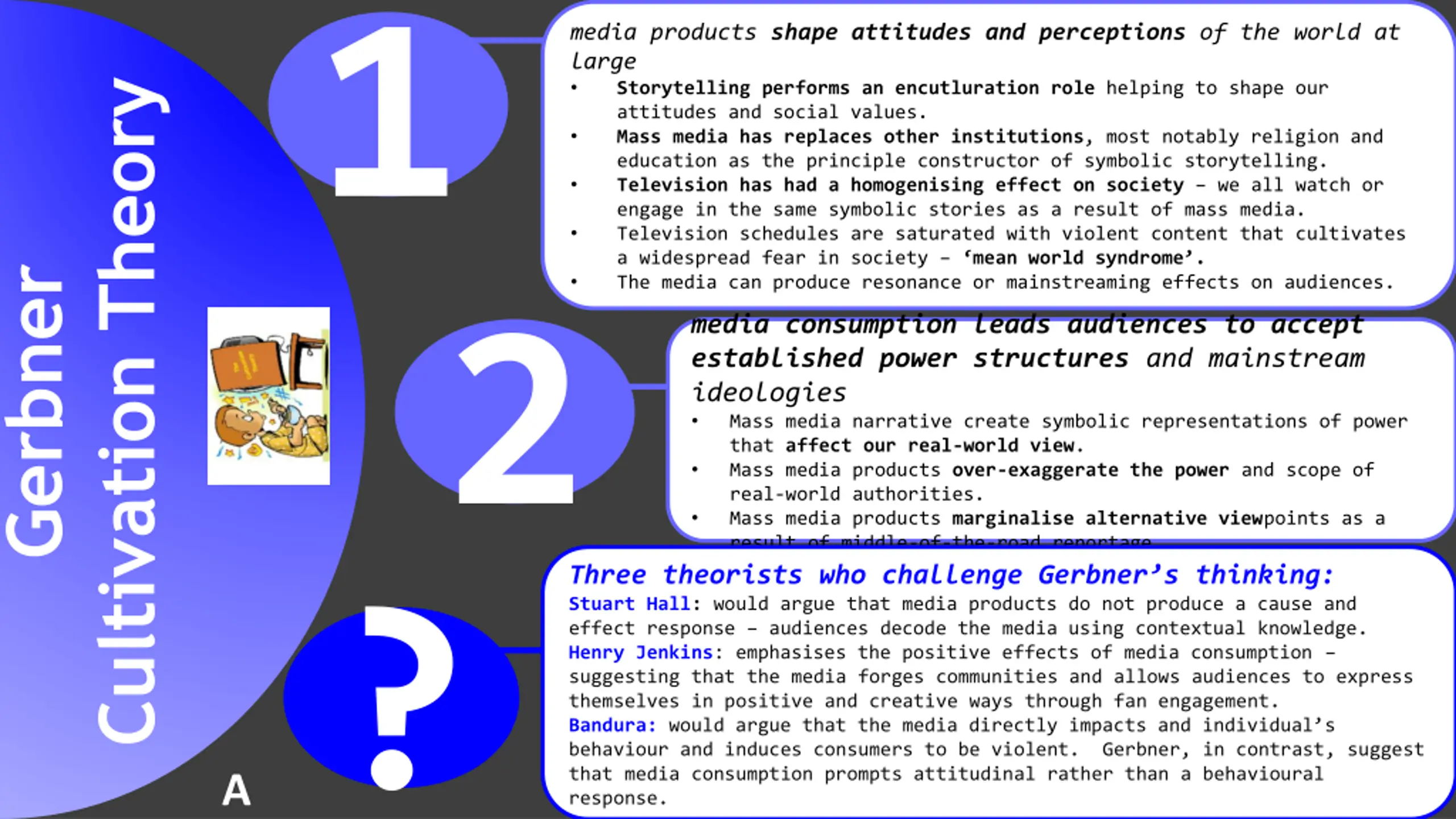 Cultivation Theory1 A media products shape attitudes and perceptions of the world at large Storytelling performs an encutluration role helping to shape our attitudes and social values. Mass media has replaces other institutions, most notably religion and education as the principle constructor of symbolic storytelling. Television has had a homogenising effect on society we all watch or engage in the same symbolic stories as a result of mass media. Television schedules are saturated with violent content that cultivates a widespread fear in society mean world syndrome . The media can produce resonance or mainstreaming effects on audiences. Gerbner 2 media consumption leads audiences to accept established power structures and mainstream ideologies Mass media narrative create symbolic representations of power that affect our real-world view. Mass media products over-exaggerate the power and scope of real-world authorities. Mass media products marginalise alternative viewpoints as a result of middle-of-the-road reportage. Three theorists who challenge Gerbner s thinking: Stuart Hall: would argue that media products do not produce a cause and effect response audiences decode the media using contextual knowledge. Henry Jenkins: emphasises the positive effects of media consumption suggesting that the media forges communities and allows audiences to express themselves in positive and creative ways through fan engagement. Bandura: would argue that the media directly impacts and individual s behaviour and induces consumers to be violent. Gerbner, in contrast, suggest that media consumption prompts attitudinal rather than a behavioural response. ?