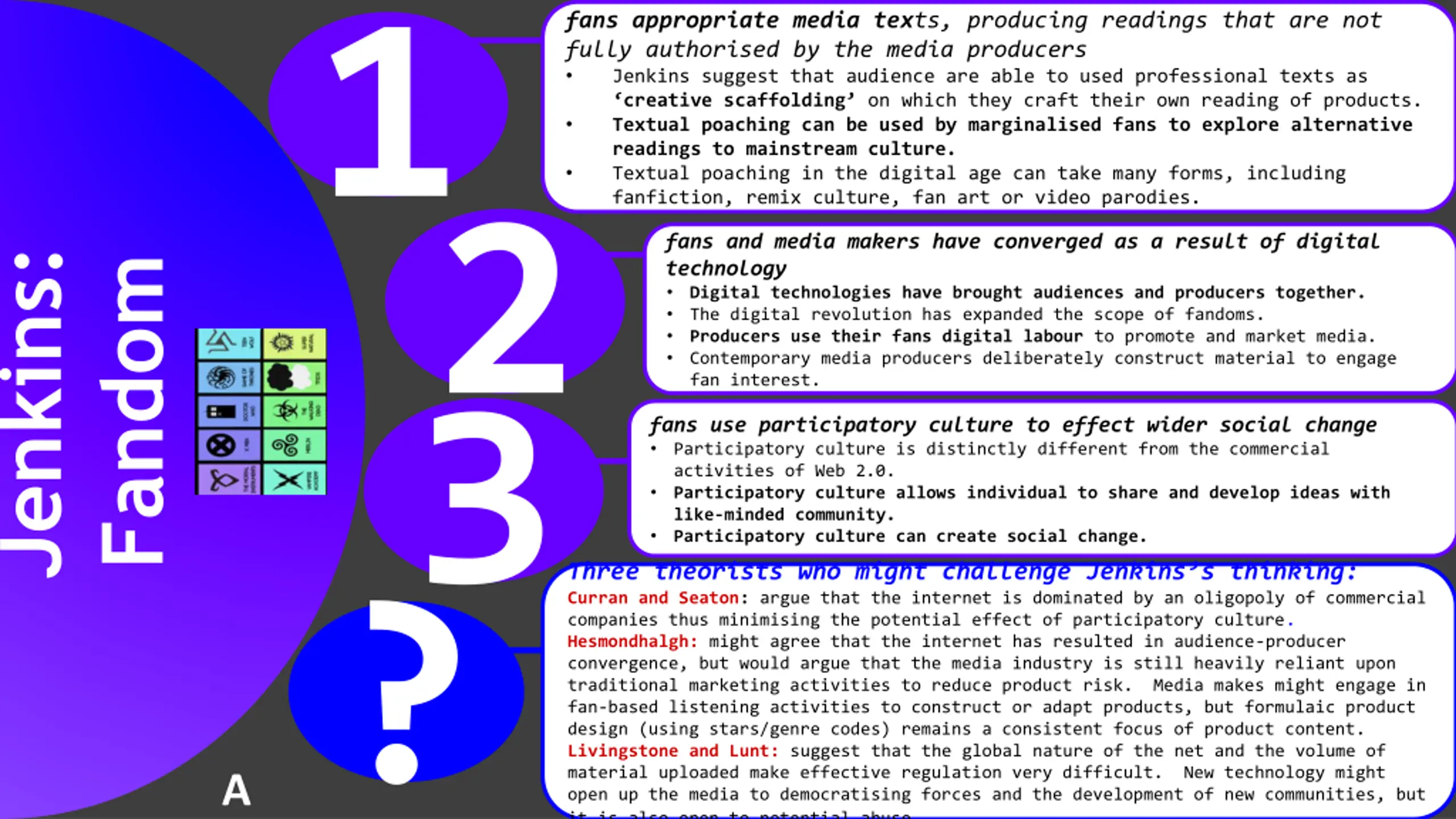 Fandom1 fans appropriate media texts, producing readings that are not fully authorised by the media producers Jenkins suggest that audience are able to used professional texts as creative scaffolding on which they craft their own reading of products. Textual poaching can be used by marginalised fans to explore alternative readings to mainstream culture. Textual poaching in the digital age can take many forms, including fanfiction, remix culture, fan art or video parodies. 2 3 fans and media makers have converged as a result of digital technology Digital technologies have brought audiences and producers together. The digital revolution has expanded the scope of fandoms. Producers use their fans digital labour to promote and market media. Contemporary media producers deliberately construct material to engage fan interest. Jenkins: fans use participatory culture to effect wider social change Participatory culture is distinctly different from the commercial activities of Web 2.0. Participatory culture allows individual to share and develop ideas with like-minded community. Participatory culture can create social change. Three theorists who might challenge Jenkins s thinking: Curran and Seaton: argue that the internet is dominated by an oligopoly of commercial companies thus minimising the potential effect of participatory culture. Hesmondhalgh: might agree that the internet has resulted in audience-producer convergence, but would argue that the media industry is still heavily reliant upon traditional marketing activities to reduce product risk. Media makes might engage in fan-based listening activities to construct or adapt products, but formulaic product design (using stars/genre codes) remains a consistent focus of product content. Livingstone and Lunt: suggest that the global nature of the net and the volume of material uploaded make effective regulation very difficult. New technology might open up the media to democratising forces and the development of new communities, but it is also open to potential abuse. ? A