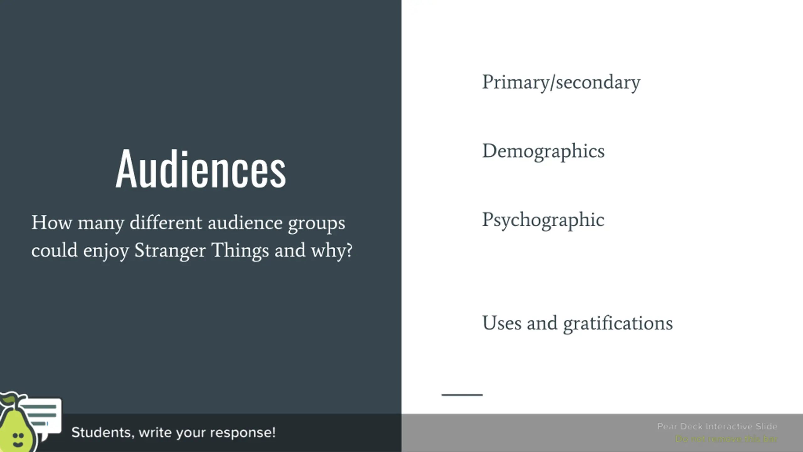 Primary/secondary Audiences How many different audience groups could enjoy Stranger Things and why? Demographics Psychographic Uses and gratifications