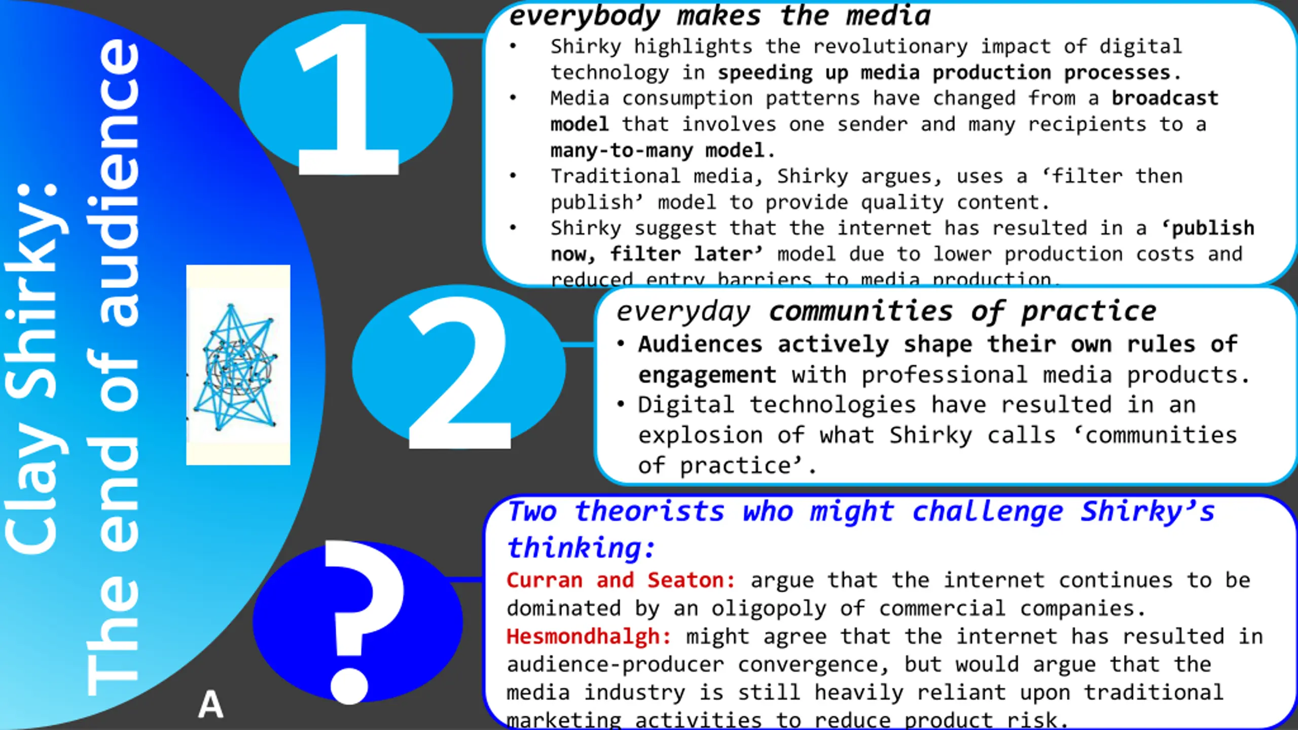 The end of audience1 A everybody makes the media Shirky highlights the revolutionary impact of digital technology in speeding up media production processes. Media consumption patterns have changed from a broadcast model that involves one sender and many recipients to a many-to-many model. Traditional media, Shirky argues, uses a filter then publish model to provide quality content. Shirky suggest that the internet has resulted in a publish now, filter later model due to lower production costs and reduced entry barriers to media production. everyday communities of practice Audiences actively shape their own rules of engagement with professional media products. Digital technologies have resulted in an explosion of what Shirky calls communities of practice . Clay Shirky: 2 Two theorists who might challenge Shirky s thinking: Curran and Seaton: argue that the internet continues to be dominated by an oligopoly of commercial companies. Hesmondhalgh: might agree that the internet has resulted in audience-producer convergence, but would argue that the media industry is still heavily reliant upon traditional marketing activities to reduce product risk. ?