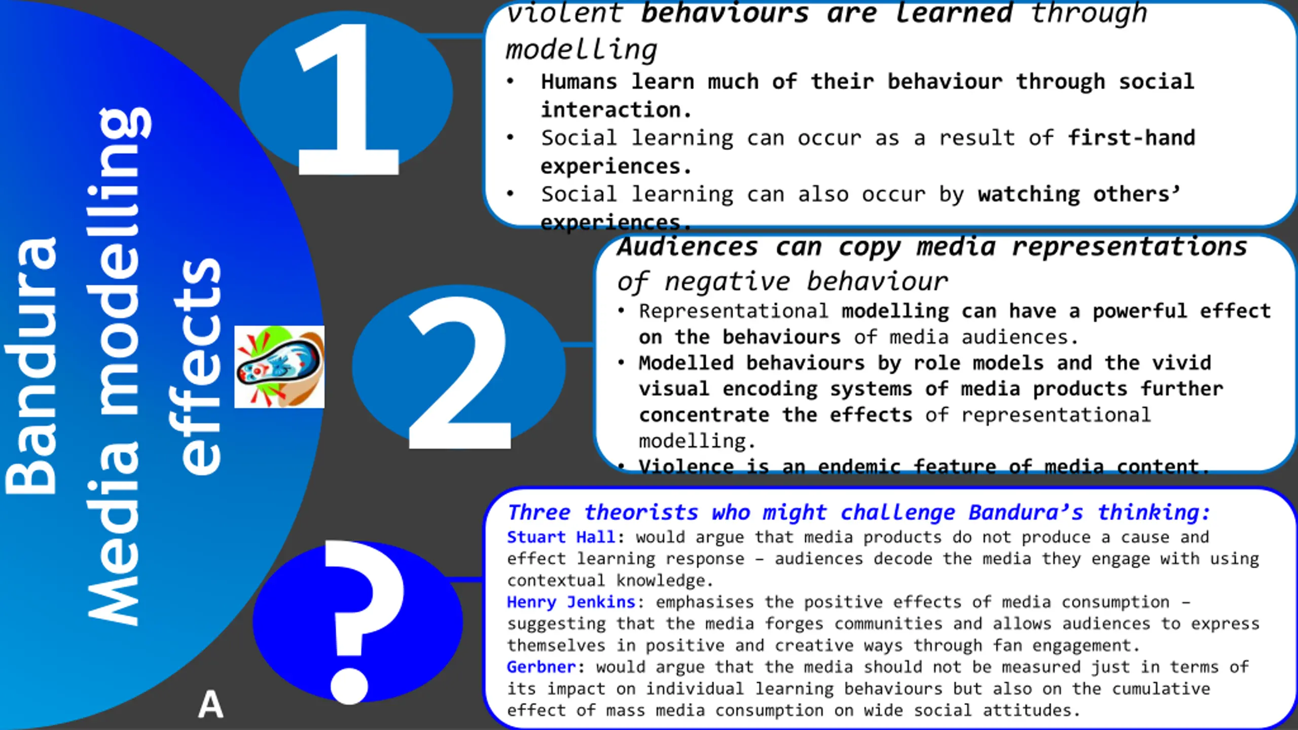 violent behaviours are learned through modelling Humans learn much of their behaviour through social interaction. Social learning can occur as a result of first-hand experiences. Social learning can also occur by watching others experiences. Audiences can copy media representations of negative behaviour Representational modelling can have a powerful effect on the behaviours of media audiences. Modelled behaviours by role models and the vivid visual encoding systems of media products further concentrate the effects of representational modelling. Violence is an endemic feature of media content. effects1 Media modelling Bandura 2 Three theorists who might challenge Bandura s thinking: Stuart Hall: would argue that media products do not produce a cause and effect learning response audiences decode the media they engage with using contextual knowledge. Henry Jenkins: emphasises the positive effects of media consumption suggesting that the media forges communities and allows audiences to express themselves in positive and creative ways through fan engagement. Gerbner: would argue that the media should not be measured just in terms of its impact on individual learning behaviours but also on the cumulative effect of mass media consumption on wide social attitudes. ? A