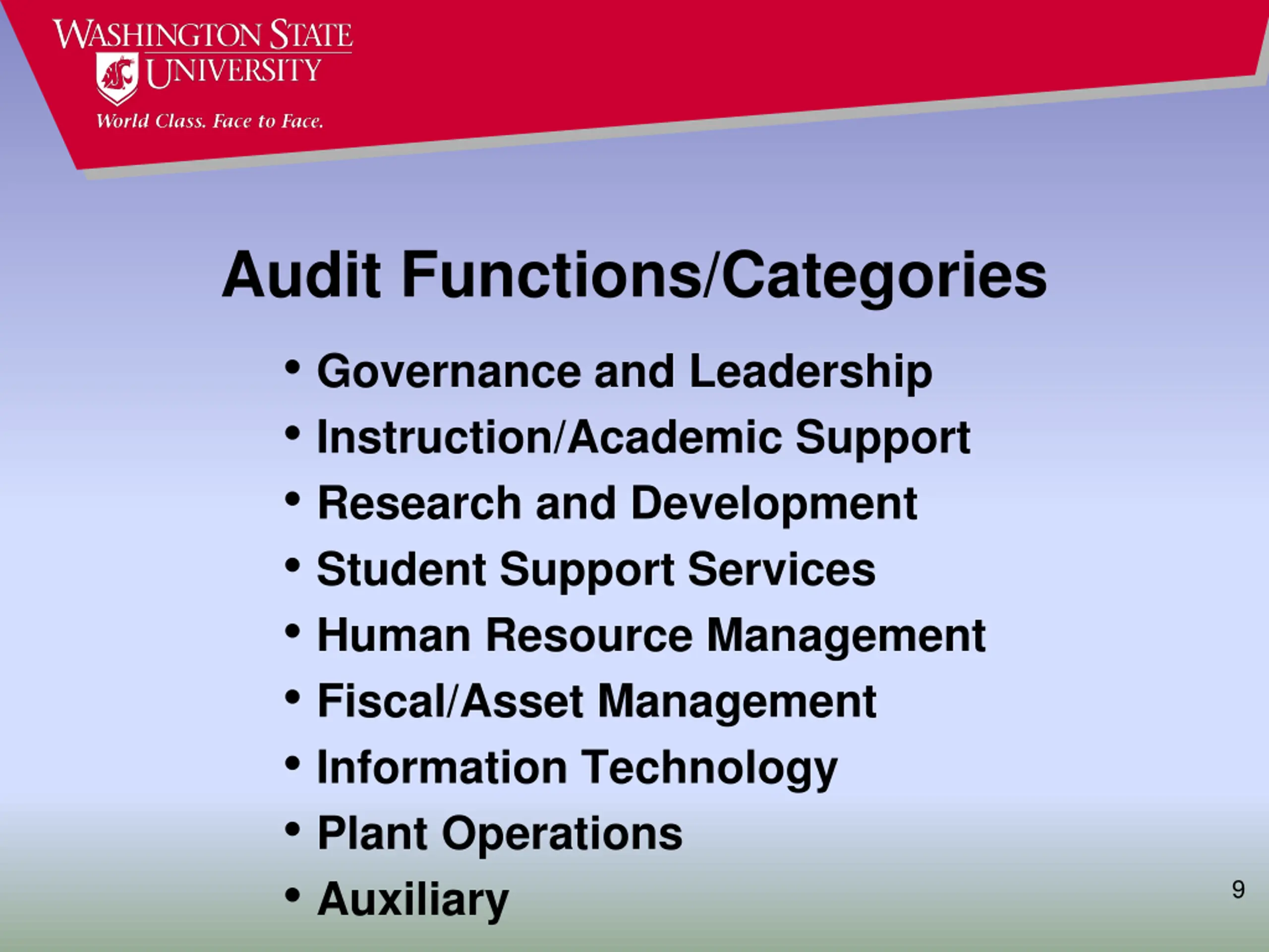 Audit Functions/Categories Governance and Leadership Instruction/Academic Support Research and Development Student Support Services Human Resource Management Fiscal/Asset Management Information Technology Plant Operations Auxiliary 9