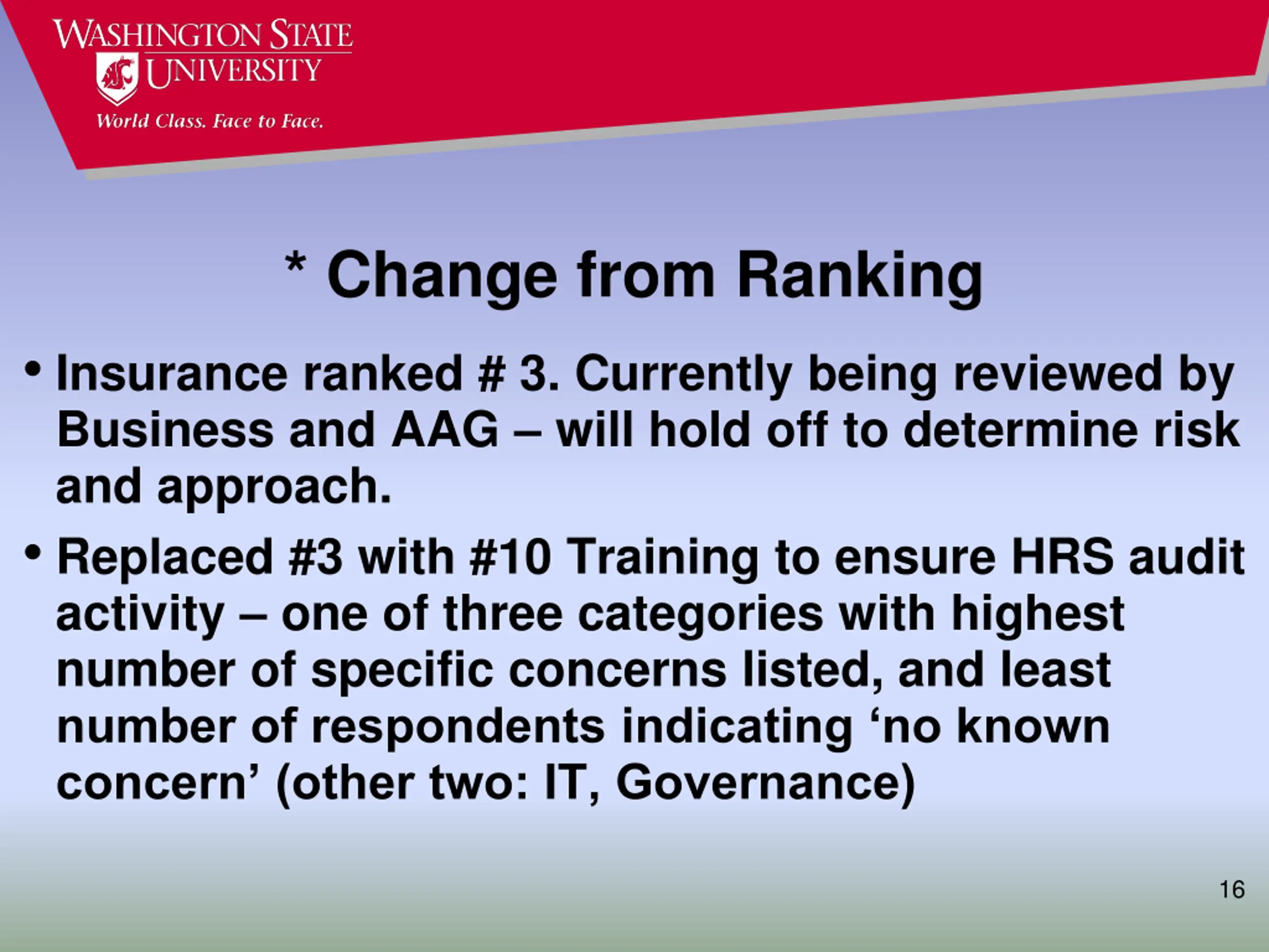 * Change from Ranking Insurance ranked # 3. Currently being reviewed by Business and AAG will hold off to determine risk and approach. Replaced #3 with #10 Training to ensure HRS audit activity one of three categories with highest number of specific concerns listed, and least number of respondents indicating no known concern (other two: IT, Governance) 16