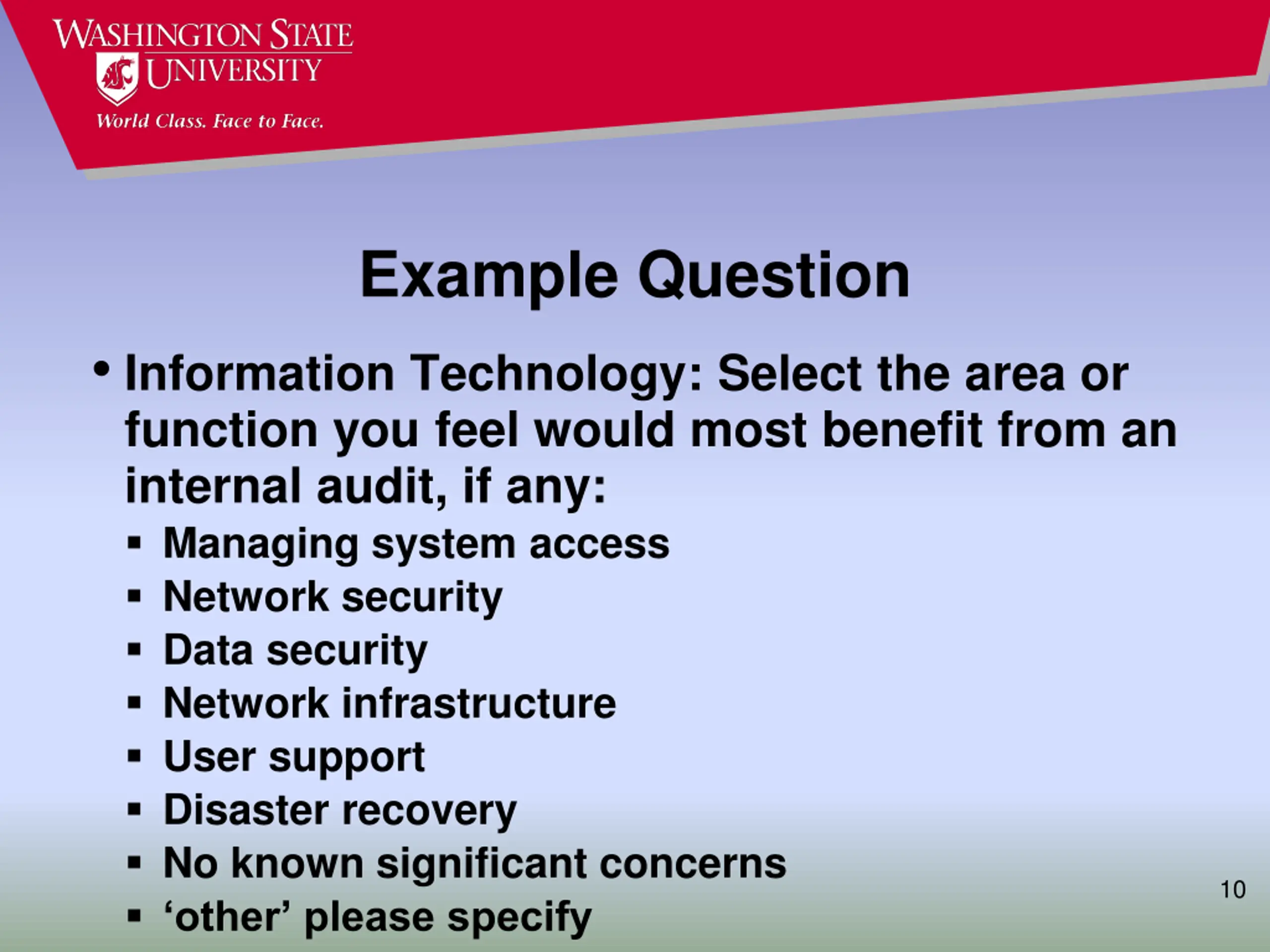 Example Question Information Technology: Select the area or function you feel would most benefit from an internal audit, if any: Managing system access Network security Data security Network infrastructure User support Disaster recovery No known significant concerns other please specify 10