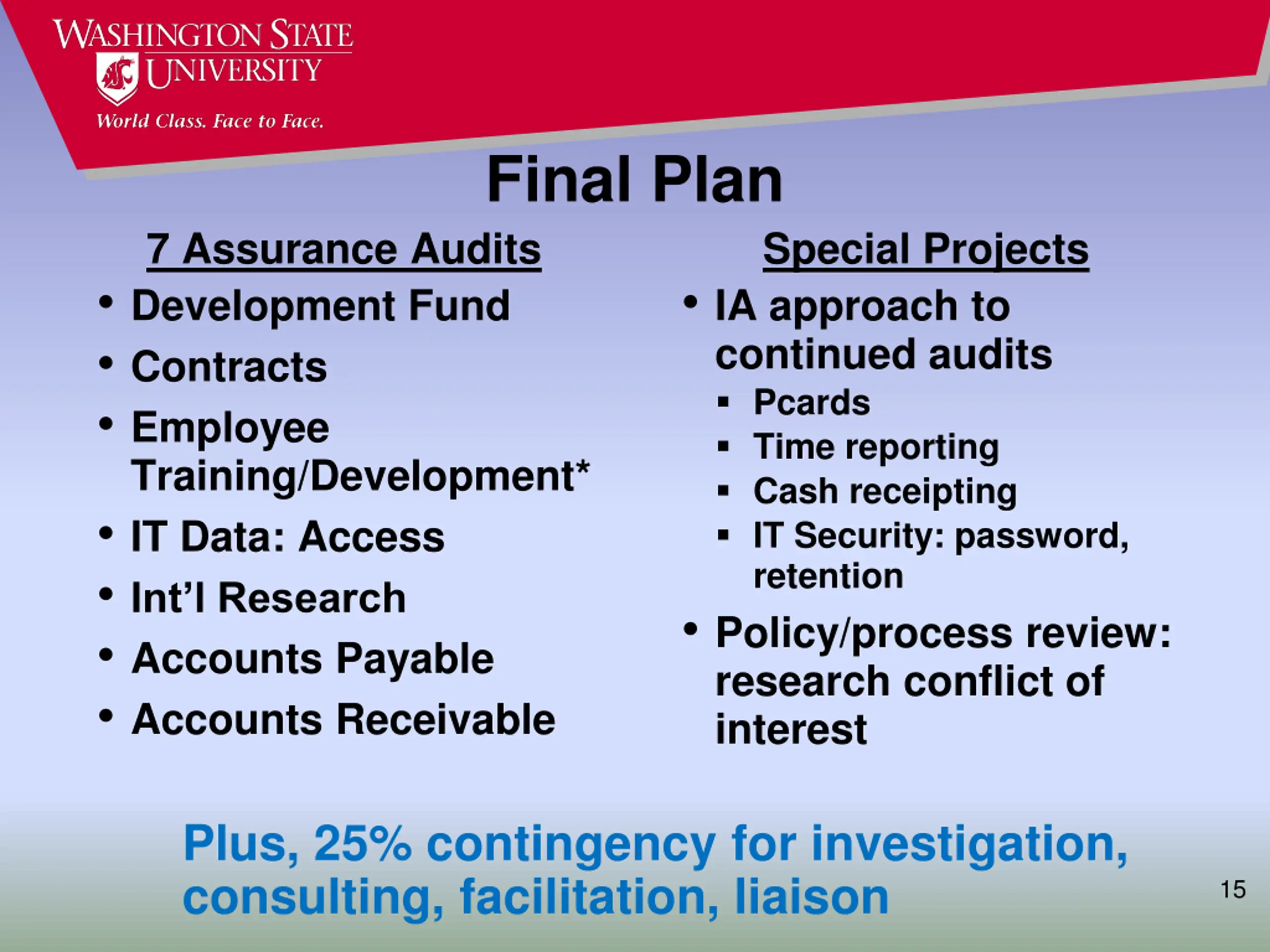 Final Plan 7 Assurance Audits Development Fund Contracts Employee Training/Development* IT Data: Access Int l Research Accounts Payable Accounts Receivable Special Projects IA approach to continued audits Pcards Time reporting Cash receipting IT Security: password, retention Policy/process review: research conflict of interest Plus, 25% contingency for investigation, consulting, facilitation, liaison 15