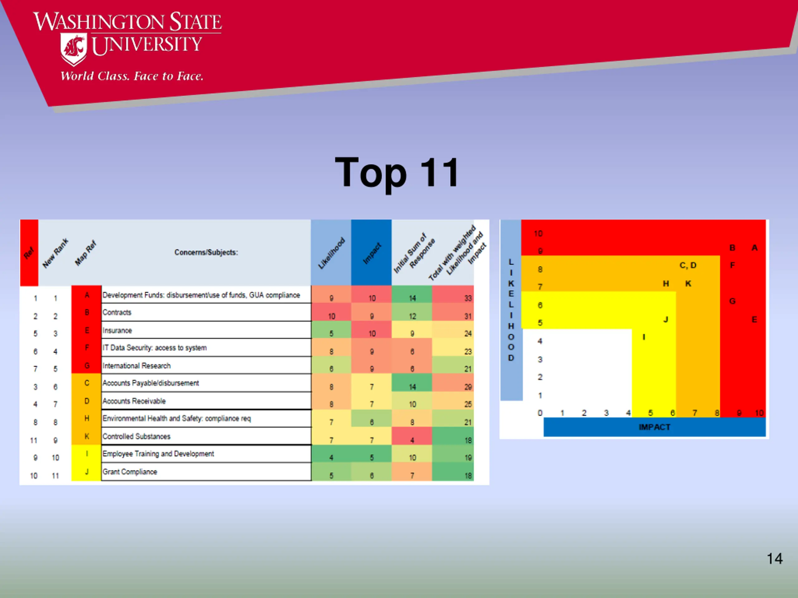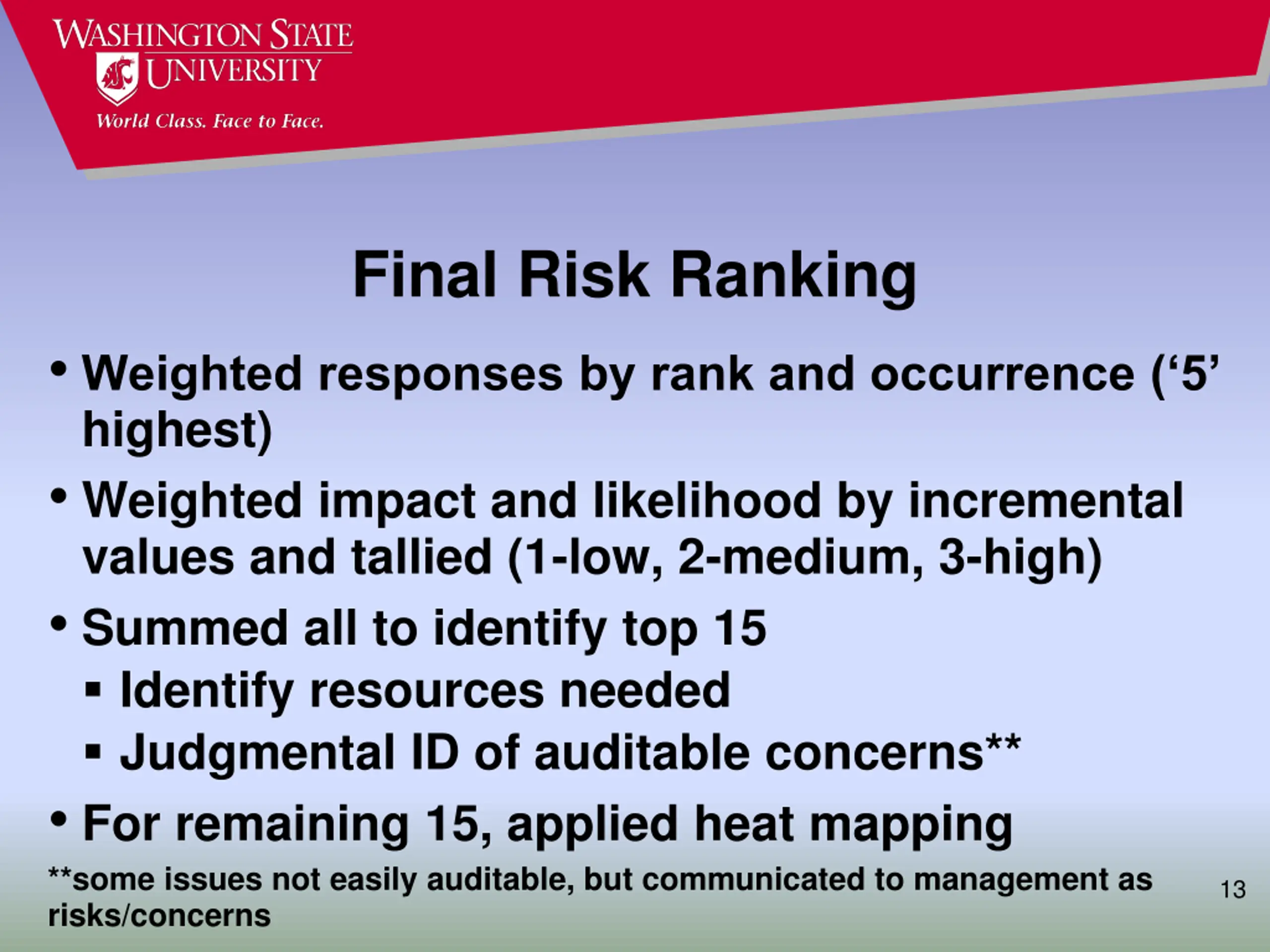 Final Risk Ranking Weighted responses by rank and occurrence ( 5 highest) Weighted impact and likelihood by incremental values and tallied (1-low, 2-medium, 3-high) Summed all to identify top 15 Identify resources needed Judgmental ID of auditable concerns** For remaining 15, applied heat mapping **some issues not easily auditable, but communicated to management as risks/concerns 13