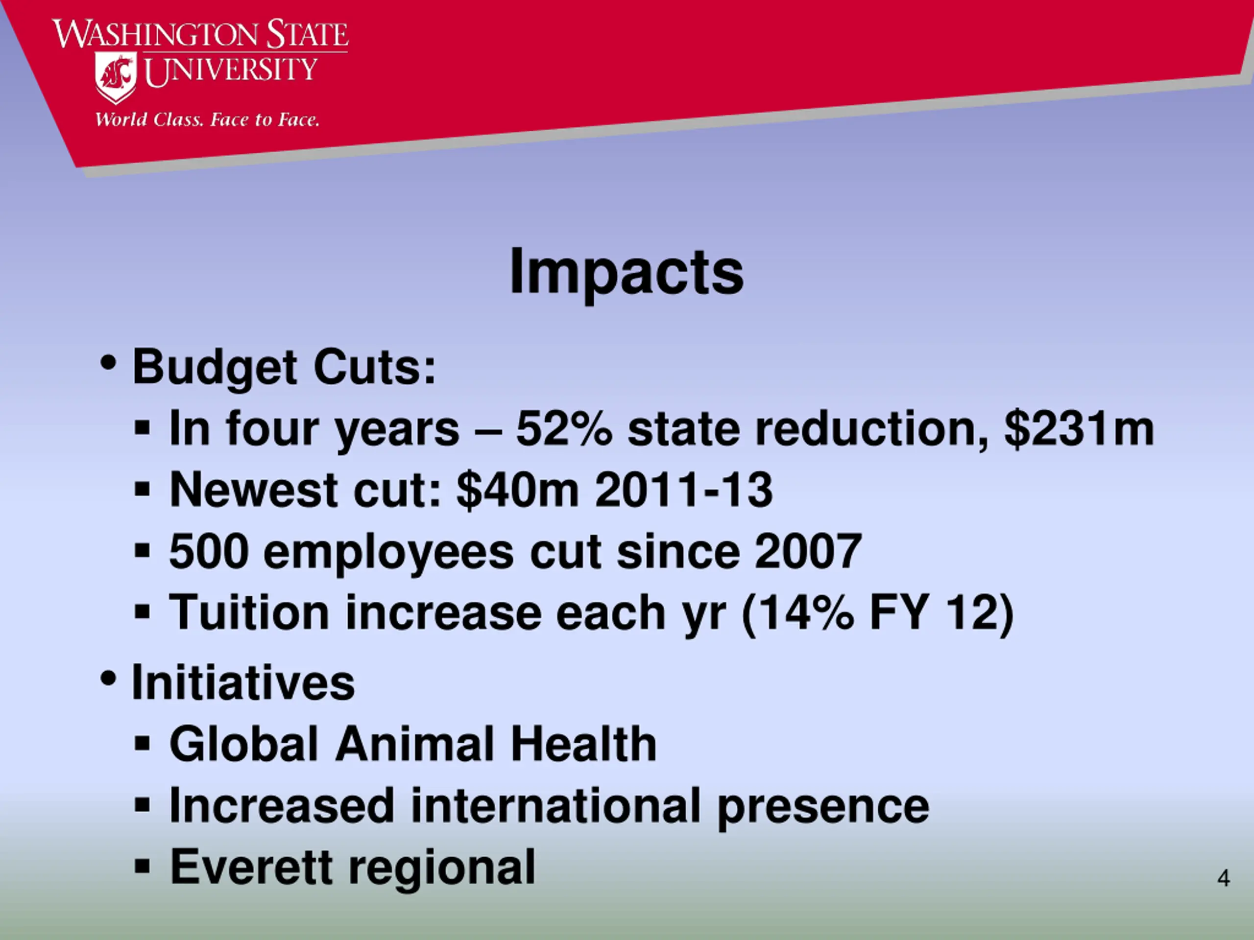 Impacts Budget Cuts: In four years 52% state reduction, $231m Newest cut: $40m 2011-13 500 employees cut since 2007 Tuition increase each yr (14% FY 12) Initiatives Global Animal Health Increased international presence Everett regional 4