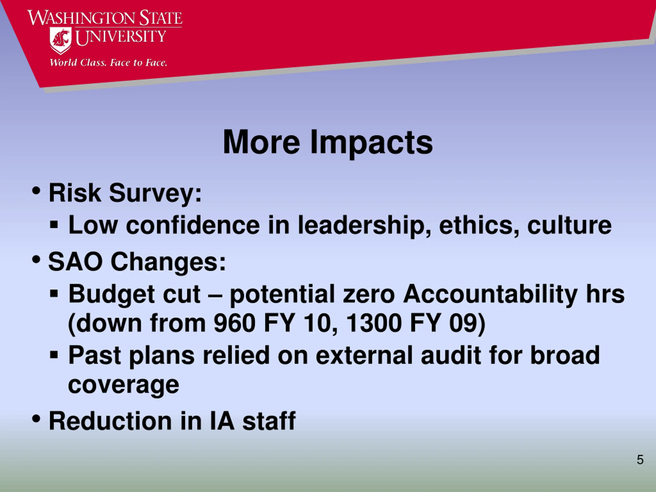 More Impacts Risk Survey: Low confidence in leadership, ethics, culture SAO Changes: Budget cut potential zero Accountability hrs (down from 960 FY 10, 1300 FY 09) Past plans relied on external audit for broad coverage Reduction in IA staff 5