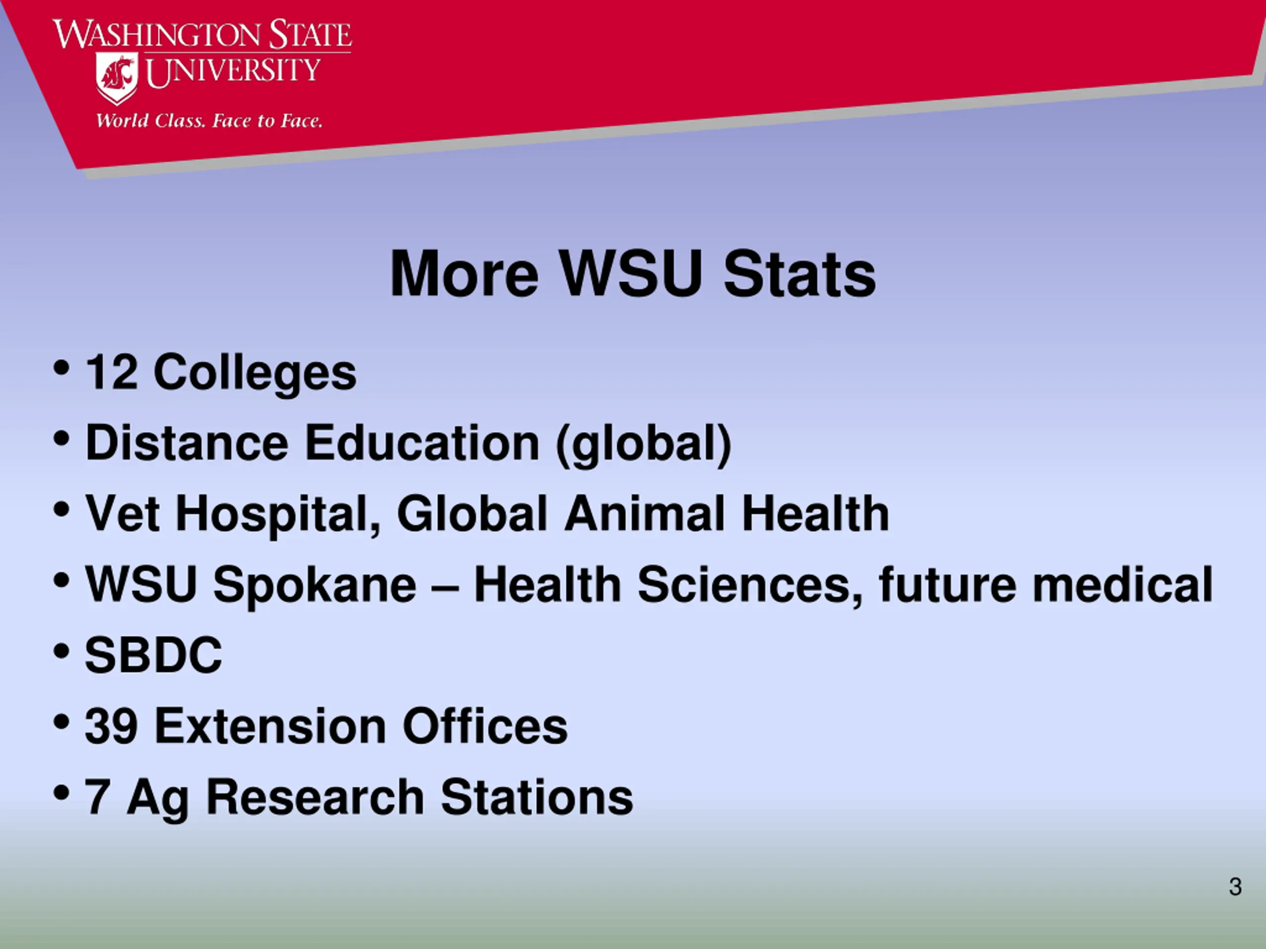 More WSU Stats 12 Colleges Distance Education (global) Vet Hospital, Global Animal Health WSU Spokane Health Sciences, future medical SBDC 39 Extension Offices 7 Ag Research Stations 3