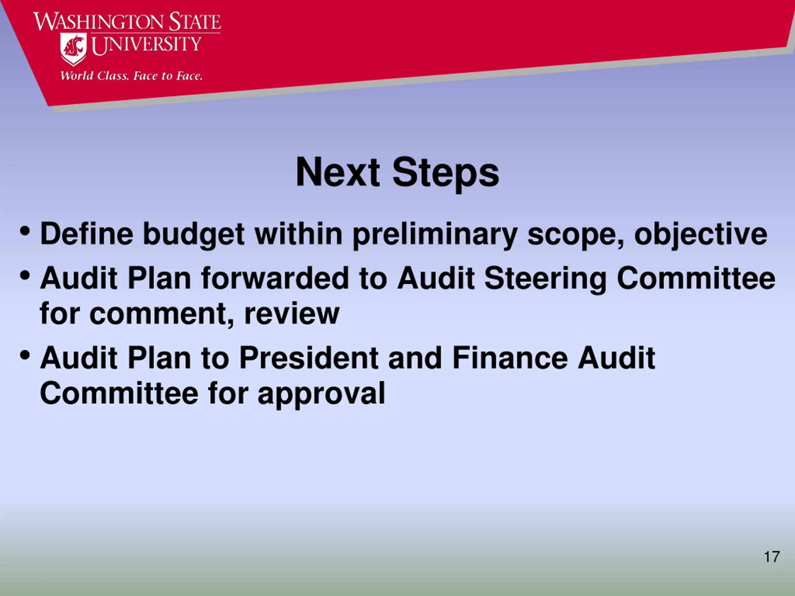 Next Steps Define budget within preliminary scope, objective Audit Plan forwarded to Audit Steering Committee for comment, review Audit Plan to President and Finance Audit Committee for approval 17