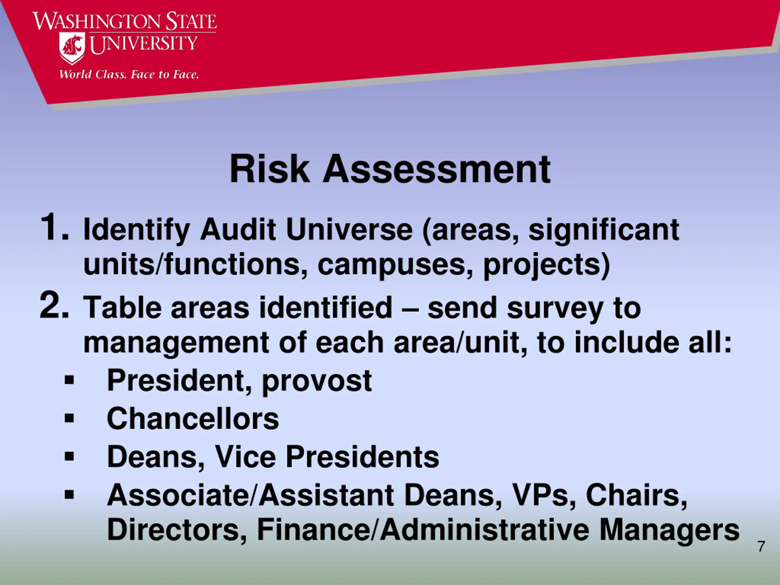 Risk Assessment 1. Identify Audit Universe (areas, significant units/functions, campuses, projects) 2. Table areas identified send survey to management of each area/unit, to include all: President, provost Chancellors Deans, Vice Presidents Associate/Assistant Deans, VPs, Chairs, Directors, Finance/Administrative Managers 7