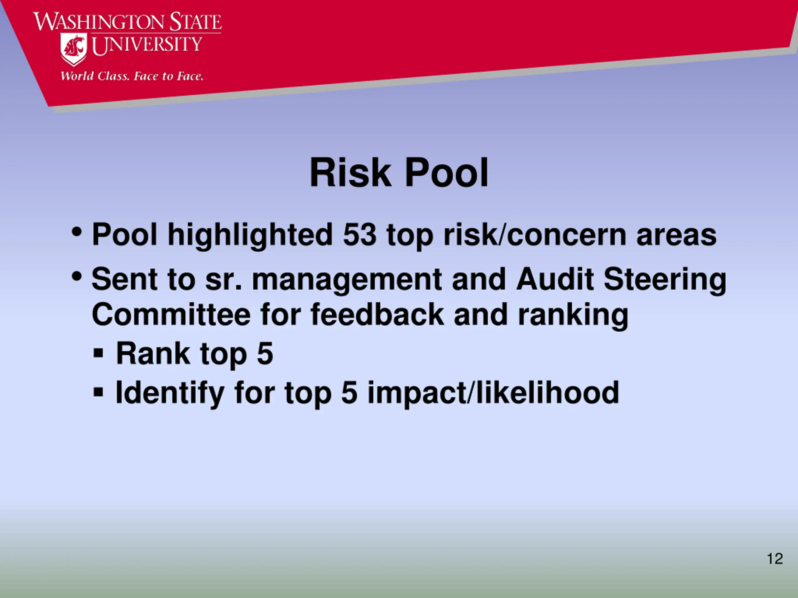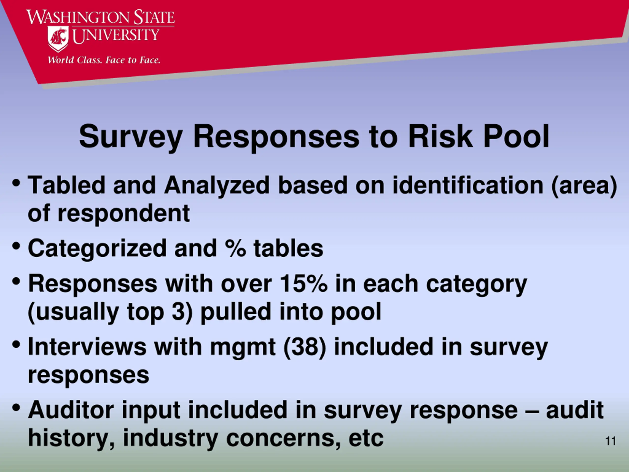 Survey Responses to Risk Pool Tabled and Analyzed based on identification (area) of respondent Categorized and % tables Responses with over 15% in each category (usually top 3) pulled into pool Interviews with mgmt (38) included in survey responses Auditor input included in survey response audit history, industry concerns, etc 11