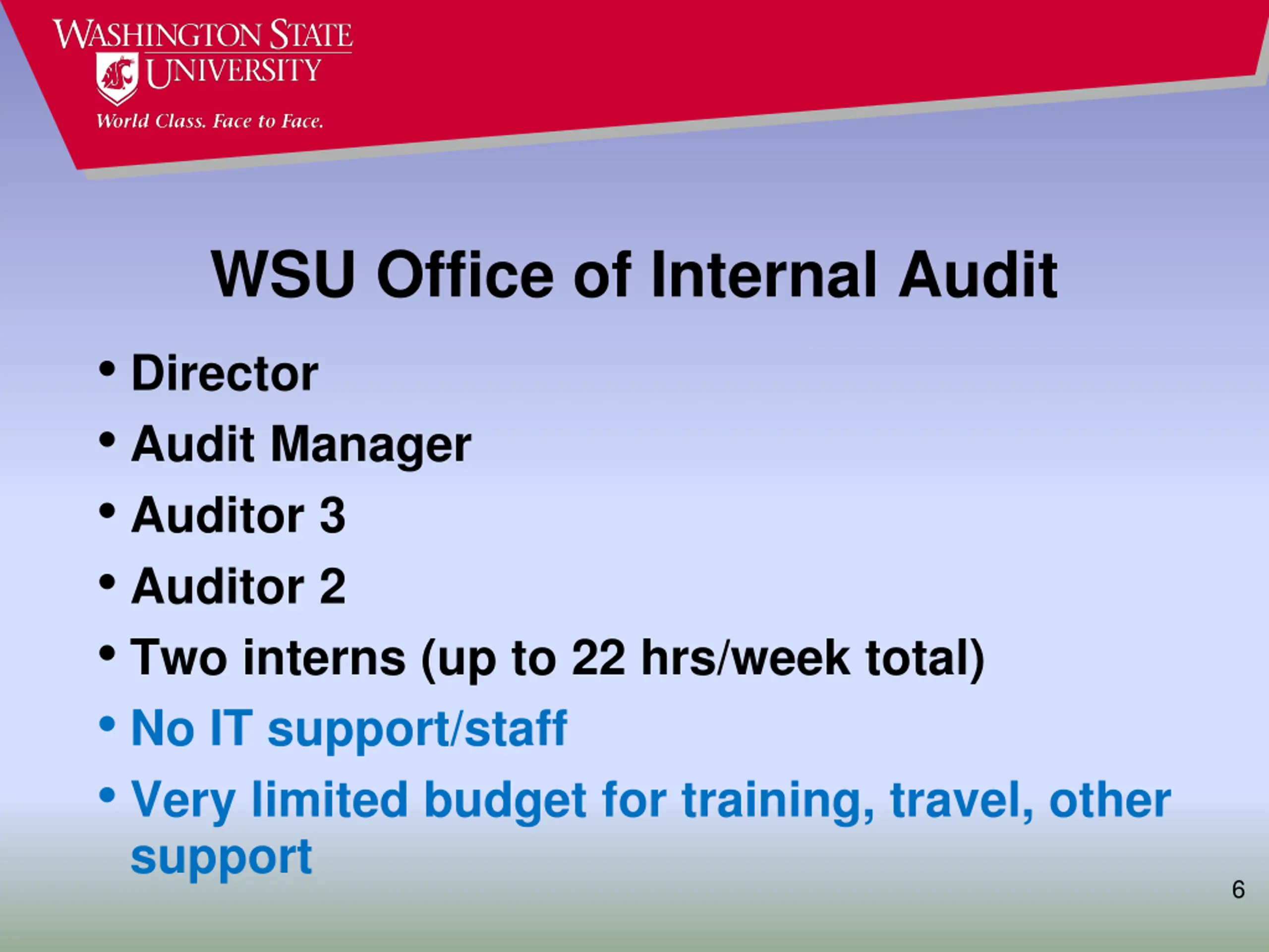 WSU Office of Internal Audit Director Audit Manager Auditor 3 Auditor 2 Two interns (up to 22 hrs/week total) No IT support/staff Very limited budget for training, travel, other support 6
