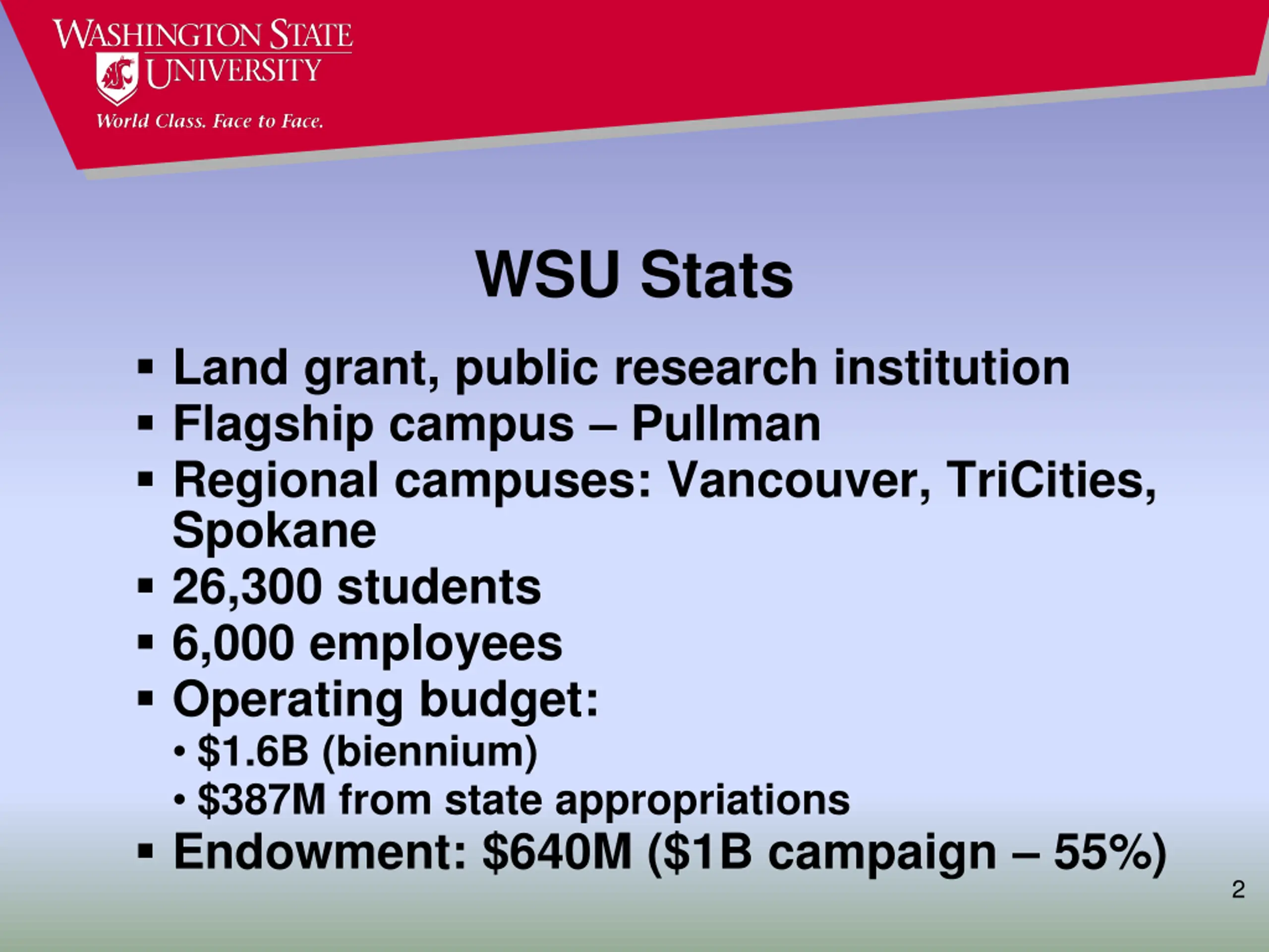 WSU Stats Land grant, public research institution Flagship campus Pullman Regional campuses: Vancouver, TriCities, Spokane 26,300 students 6,000 employees Operating budget: $1.6B (biennium) $387M from state appropriations Endowment: $640M ($1B campaign 55%) 2