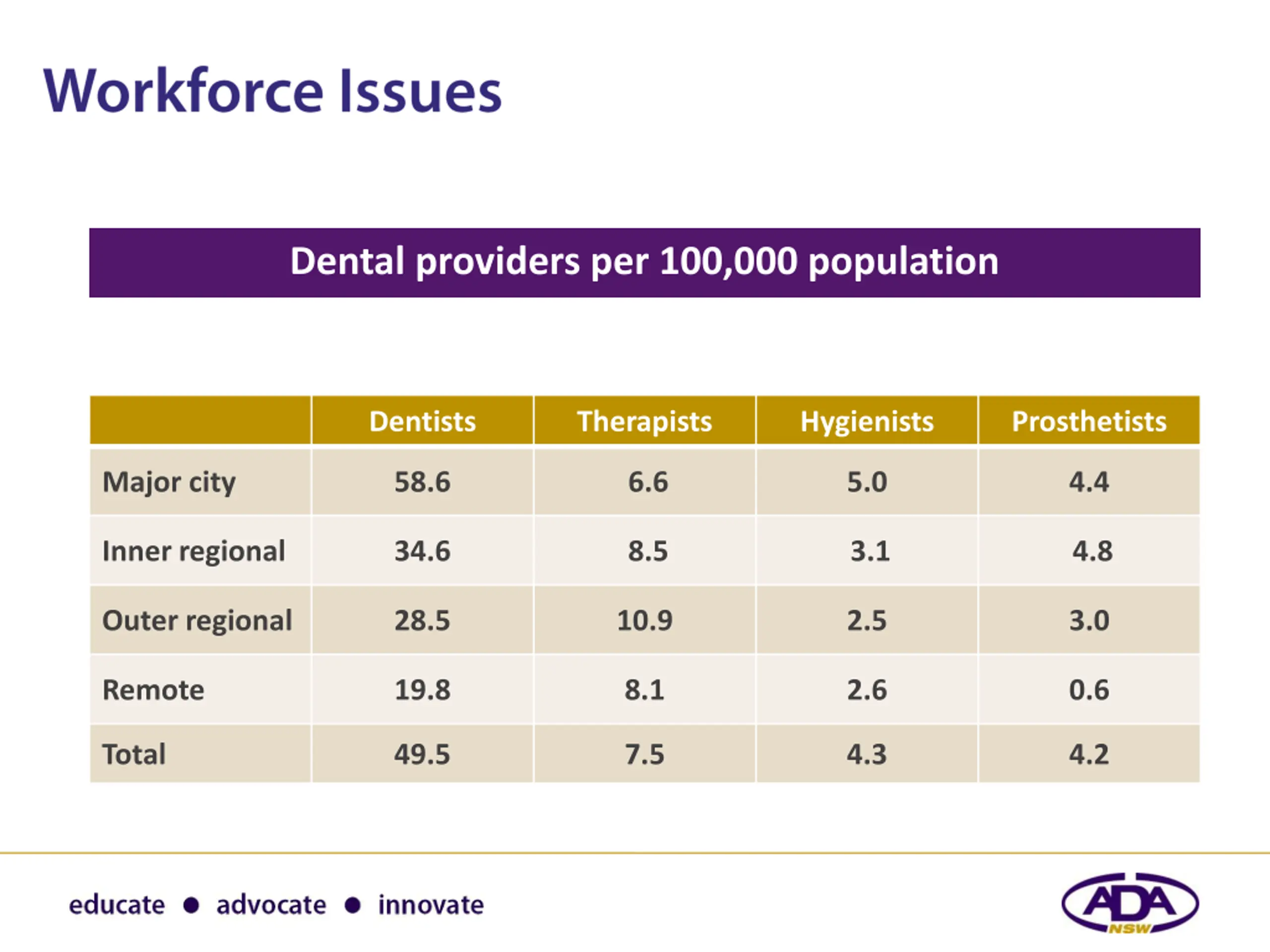 Dental providers per 100,000 population Dentists Therapists Hygienists Prosthetists Major city 58.6 6.6 5.0 4.4 Inner regional 34.6 8.5 3.1 4.8 Outer regional 28.5 10.9 2.5 3.0 Remote 19.8 8.1 2.6 0.6 Total 49.5 7.5 4.3 4.2