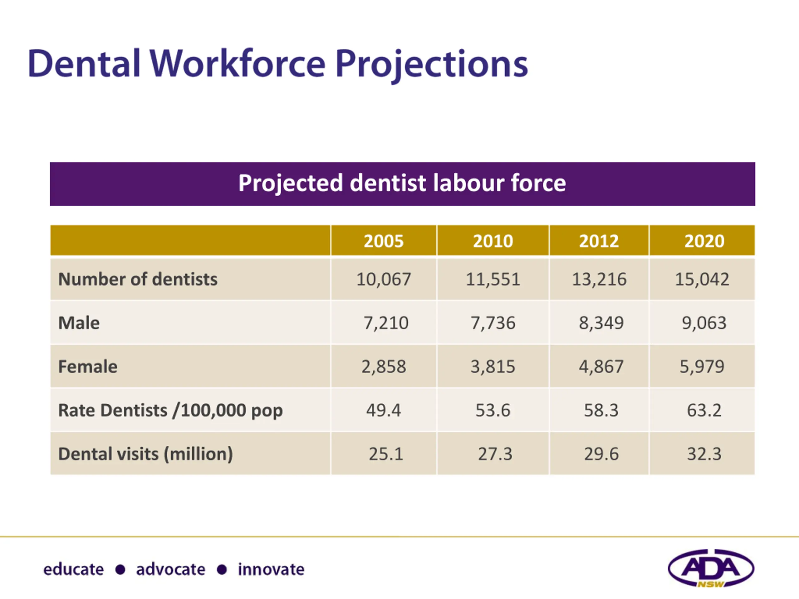 Projected dentist labour force 2005 2010 2012 2020 Number of dentists 10,067 11,551 13,216 15,042 Male 7,210 7,736 8,349 9,063 Female 2,858 3,815 4,867 5,979 Rate Dentists /100,000 pop 49.4 53.6 58.3 63.2 Dental visits (million) 25.1 27.3 29.6 32.3
