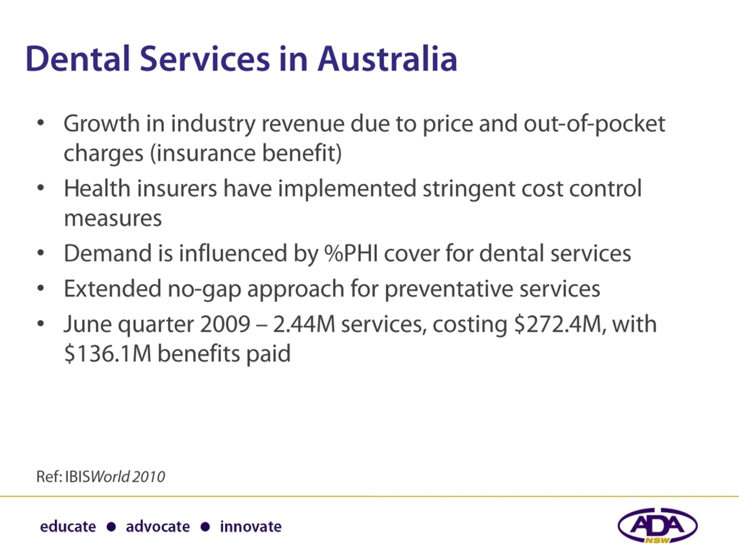 Australian Dental Association (ADA Inc) advocates on behalf of all ADA members with the Federal Government and other non-government bodies. www.ada.org.au Branches provide jurisdictional advocacy and services to members www.adansw.com.au www.adacpd.com.au www.dentaldml.com