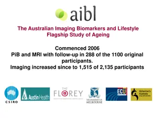 The Australian Imaging Biomarkers and Lifestyle Study of Ageing (AIBL) commenced in late 2006, with a cohort size and follow-up progress detailed. The study includes assessments and biomarker imaging, such as MRI, amyloid PET, and tau PET scans, with ongoing review cycles and data additions. Current focus areas involve blood biomarkers, collaborations for Alzheimer's disease research, and automated analysis tools like CapAIBL for MRI and PET imaging. Detailed conversion equations for amyloid PET scans and collaborative efforts with external parties are highlighted.
