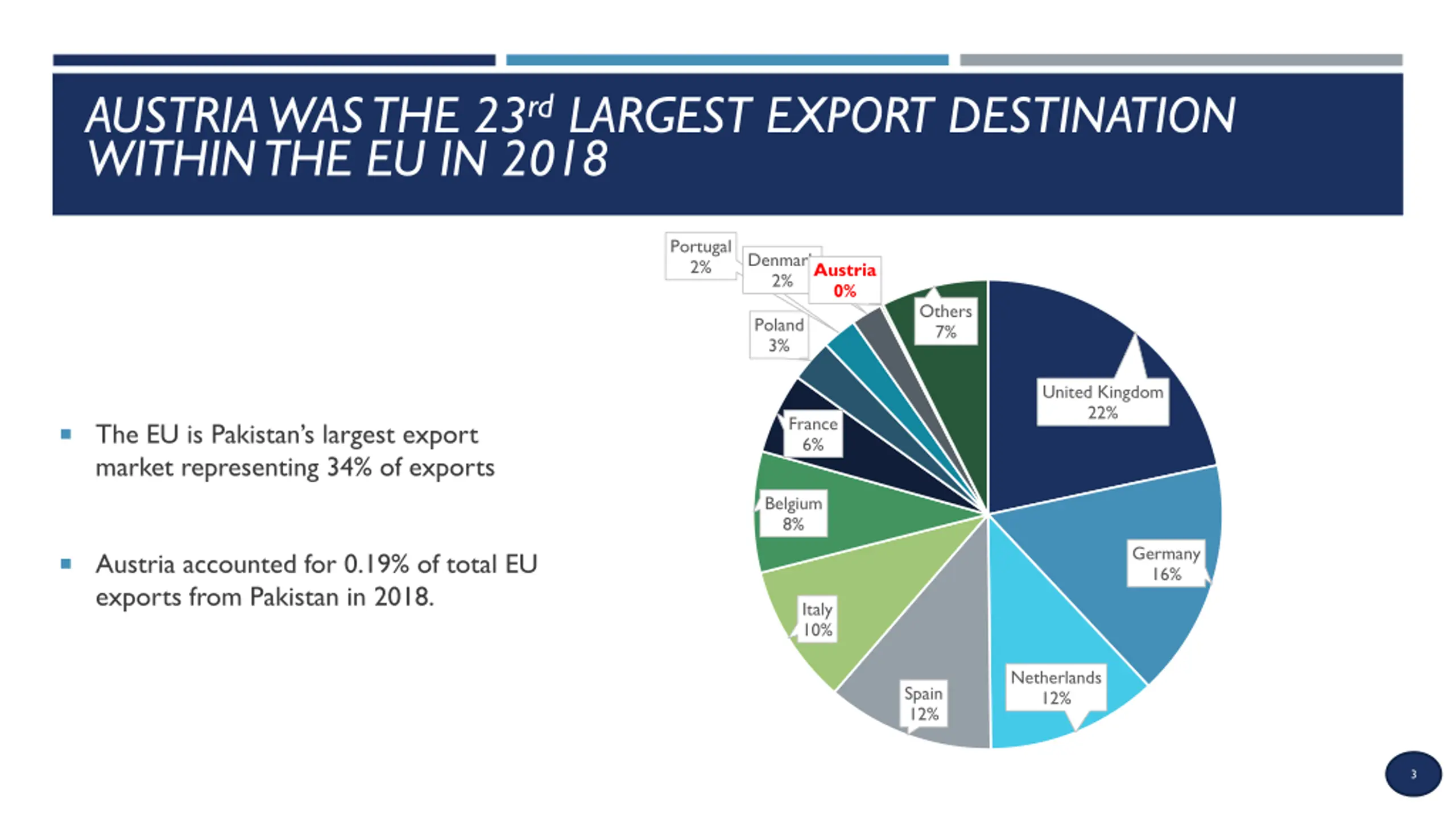 AUSTRIA WAS PAKISTANS 94th LARGEST EXPORT DESTINATION IN 2018 RANK COUNTRY EXPORT VALUE (US$) % SHARE IN TOTAL EXPORTS World United States of America China United Kingdom Afghanistan Germany United Arab Emirates Netherlands Spain Bangladesh Austria 23,630,893,000 3,802,500,000 1,818,069,000 1,728,637,000 1,347,934,000 1,310,444,000 983,575,000 942,802,000 922,898,000 783,825,000 15,056,000 1 2 3 4 5 6 7 8 9 94 16% 8% 7% 6% 6% 4% 4% 4% 3% 0.06% 2