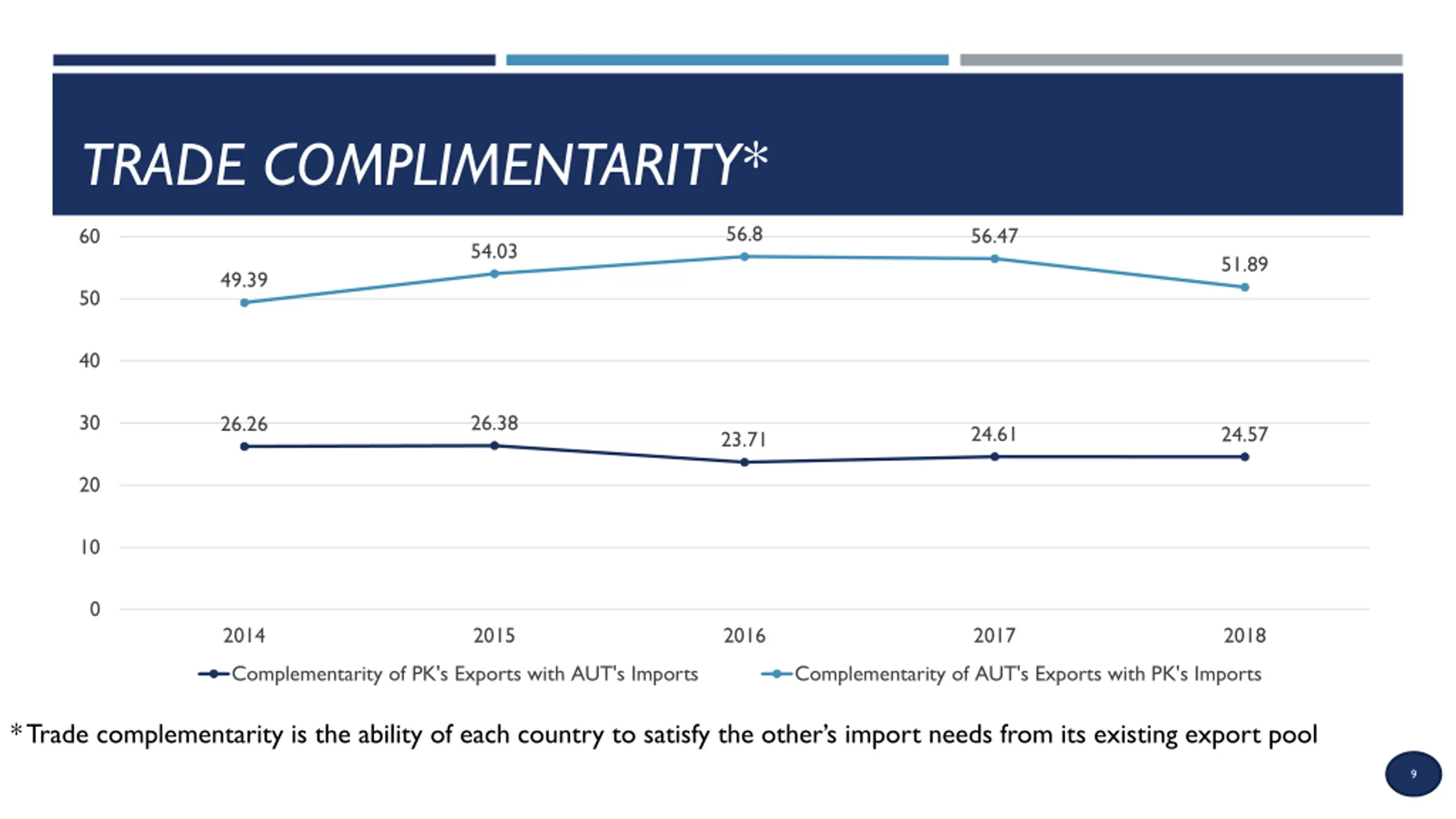 TRADE COMPLIMENTARITY* 56.8 56.47 60 54.03 51.89 49.39 50 40 30 26.38 26.26 24.61 24.57 23.71 20 10 0 2014 2015 2016 2017 2018 Complementarity of PK's Exports with AUT's Imports Complementarity of AUT's Exports with PK's Imports * Trade complementarity is the ability of each country to satisfy the other s import needs from its existing export pool 9