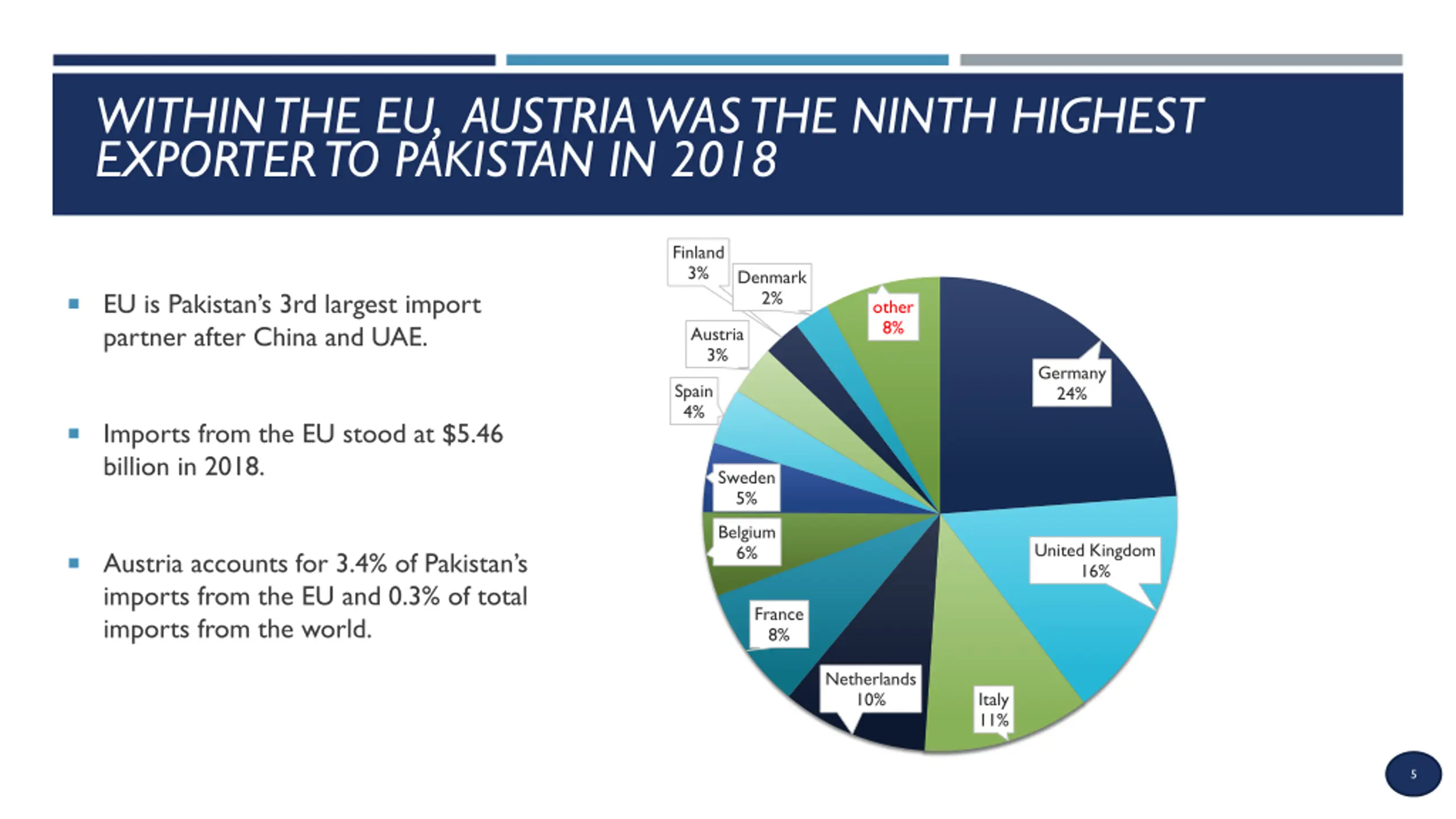WITHIN THE EU, AUSTRIA WAS THE NINTH HIGHEST EXPORTER TO PAKISTAN IN 2018 Finland 3% Denmark 2% EU is Pakistan s 3rd largest import partner after China and UAE. other 8% Austria 3% Germany 24% Spain 4% Imports from the EU stood at $5.46 billion in 2018. Sweden 5% Belgium 6% United Kingdom 16% Austria accounts for 3.4% of Pakistan s imports from the EU and 0.3% of total imports from the world. France 8% Netherlands 10% Italy 11% 5