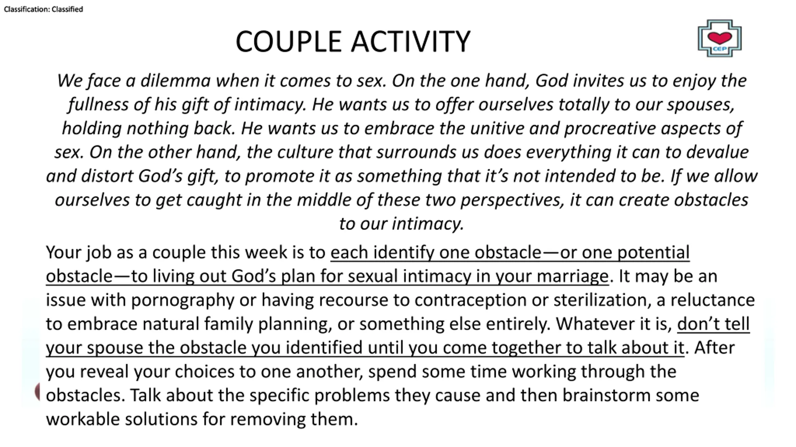Classification: Classified Classification: Classified COUPLE ACTIVITY We face a dilemma when it comes to sex. On the one hand, God invites us to enjoy the fullness of his gift of intimacy. He wants us to offer ourselves totally to our spouses, holding nothing back. He wants us to embrace the unitive and procreative aspects of sex. On the other hand, the culture that surrounds us does everything it can to devalue and distort God s gift, to promote it as something that it s not intended to be. If we allow ourselves to get caught in the middle of these two perspectives, it can create obstacles to our intimacy. Your job as a couple this week is to each identify one obstacle or one potential obstacle to living out God s plan for sexual intimacy in your marriage. It may be an issue with pornography or having recourse to contraception or sterilization, a reluctance to embrace natural family planning, or something else entirely. Whatever it is, don t tell your spouse the obstacle you identified until you come together to talk about it. After you reveal your choices to one another, spend some time working through the obstacles. Talk about the specific problems they cause and then brainstorm some workable solutions for removing them.